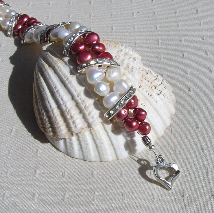 This Stunning Bracelet is made from Beautiful Freshwater Pearls… Red & White, grouped together in Fives separated by a spacer bar studded with Glistening Crystals positioned at an angle - A Beautiful Combination that will look stunning for either the casual look or wear it with something more Elegant for a Special Evening out