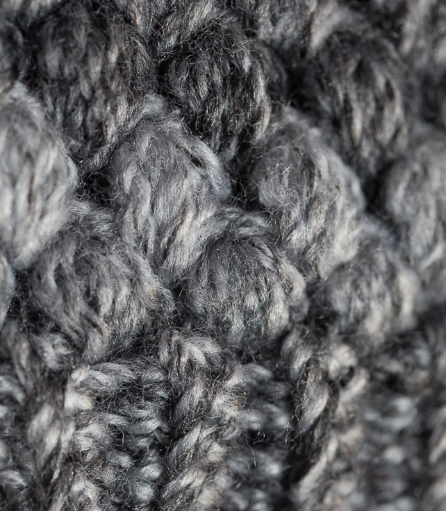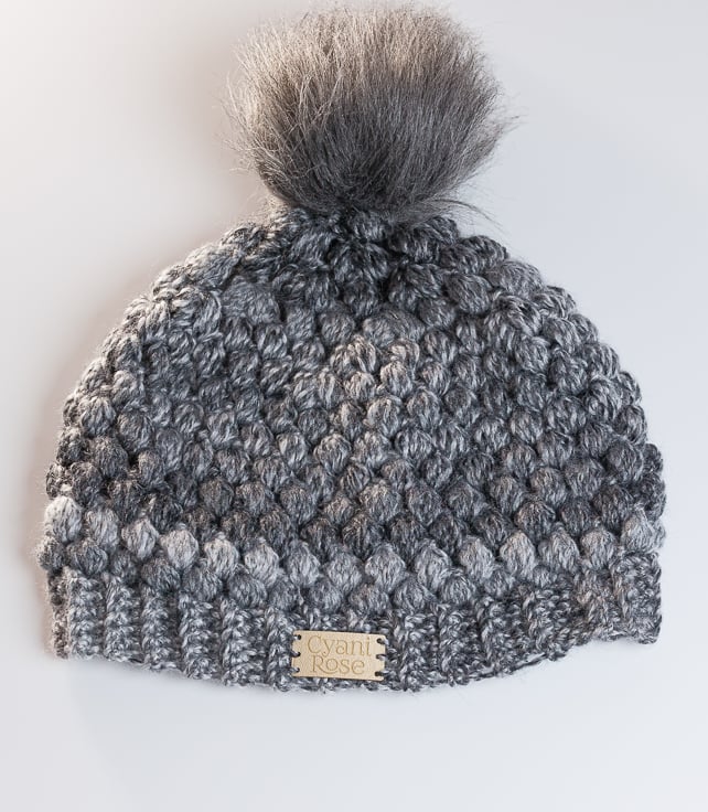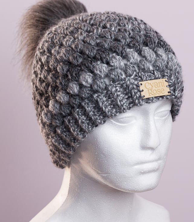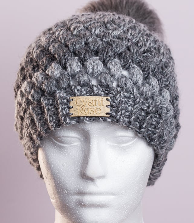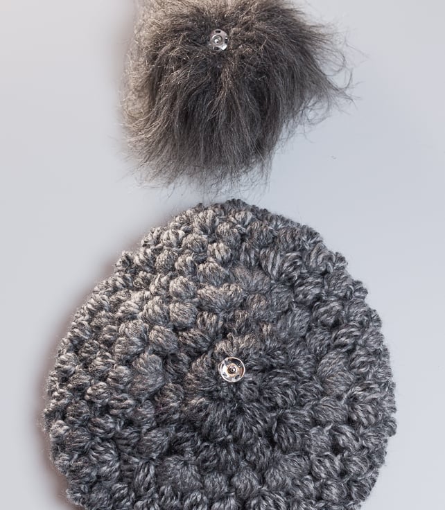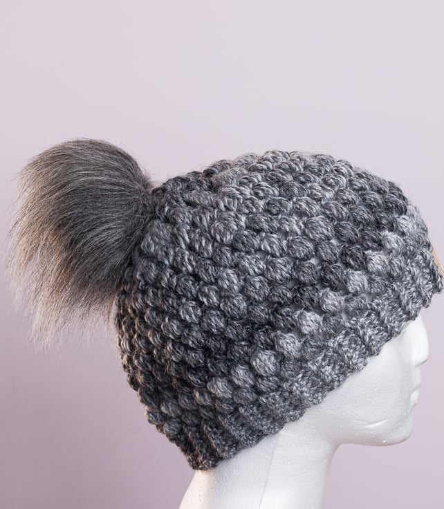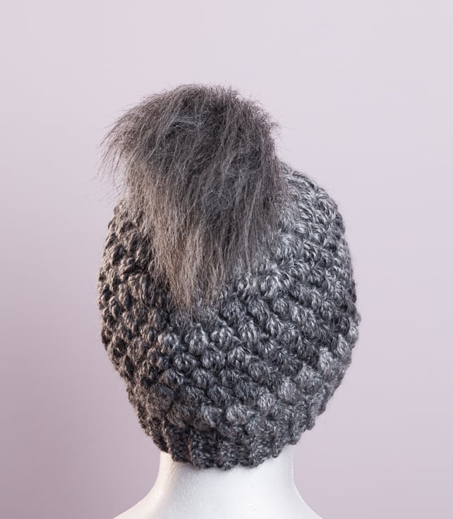 It is a lovely grey colour with a fluffy grey pompom. I have also hand made the pompom from faux fur material. I decided to make my own after reading reports that some faux fur pompoms sold on the high street were shown to contain animal fur. By making them myself I can see the back of the fabric structure and you can see it is not an animal product. It is stuffed with acrylic toy stuffing.