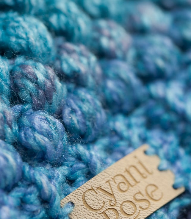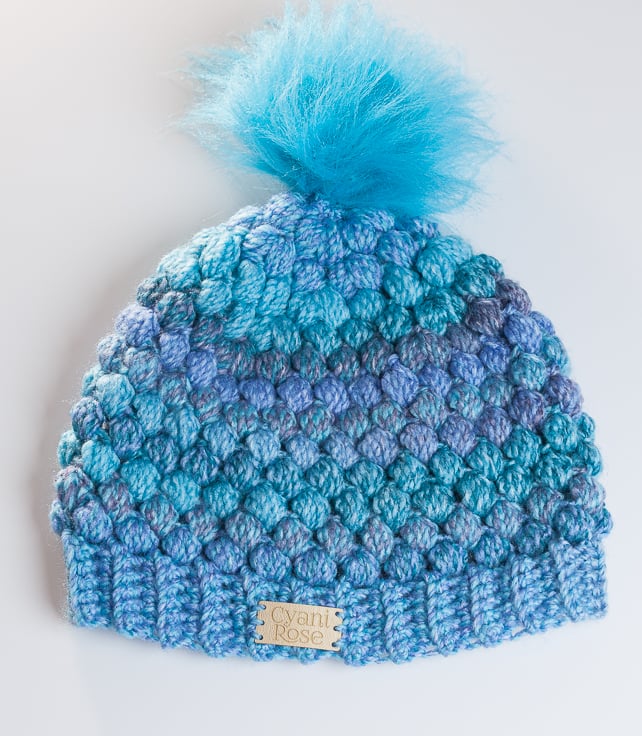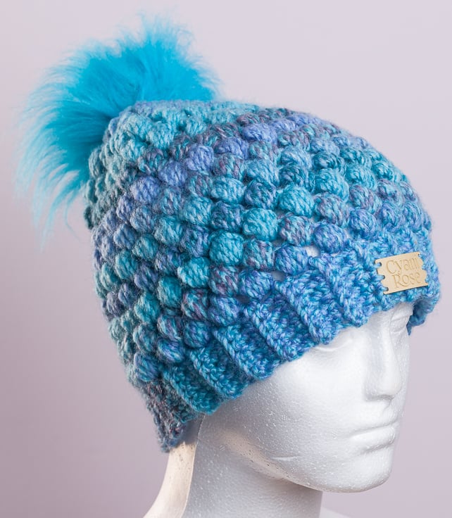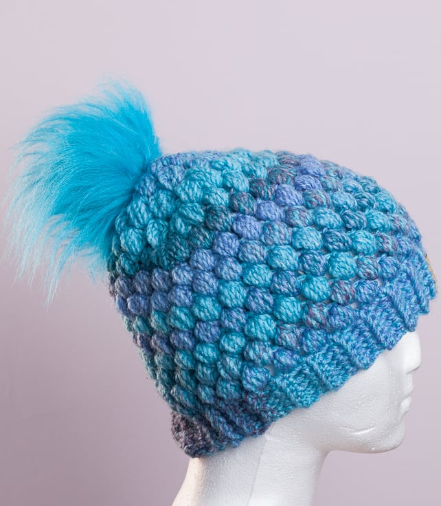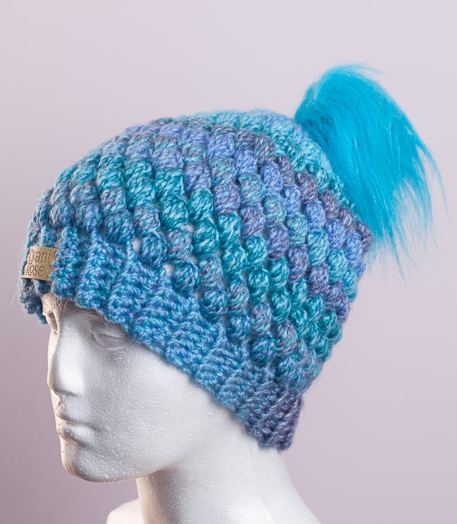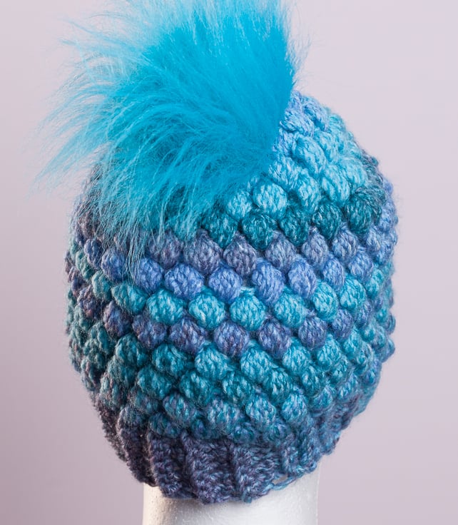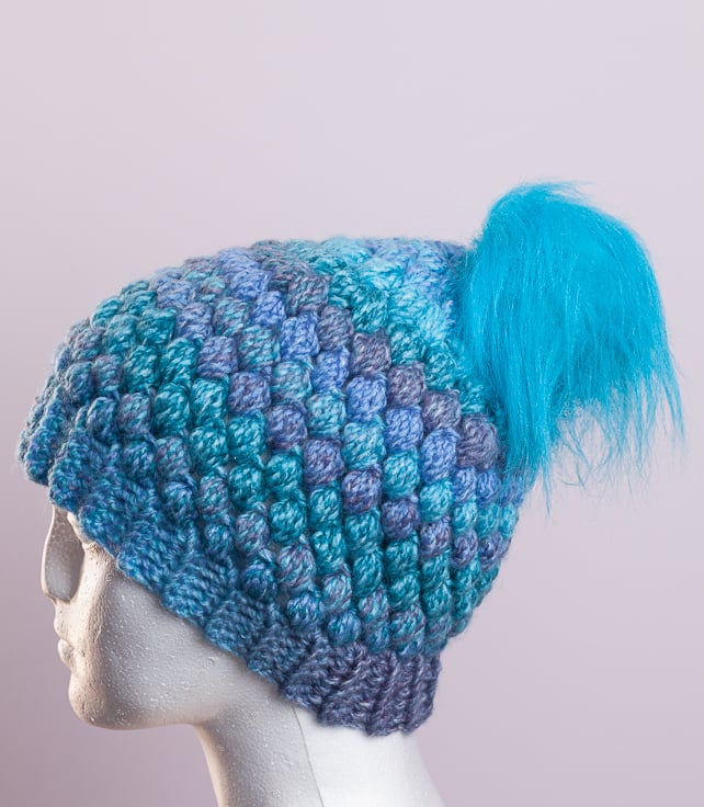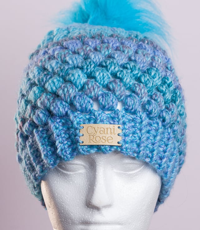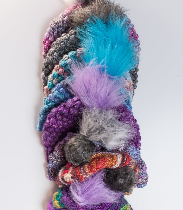 It is a lovely purple colour with a fluffy lilac pompom. I have also hand made the pompom from faux fur material. I decided to make my own after reading reports that some faux fur pompoms sold on the high street were shown to contain animal fur. By making them myself I can see the back of the fabric structure and you can tell it is not an animal product. It is stuffed with acrylic toy stuffing.