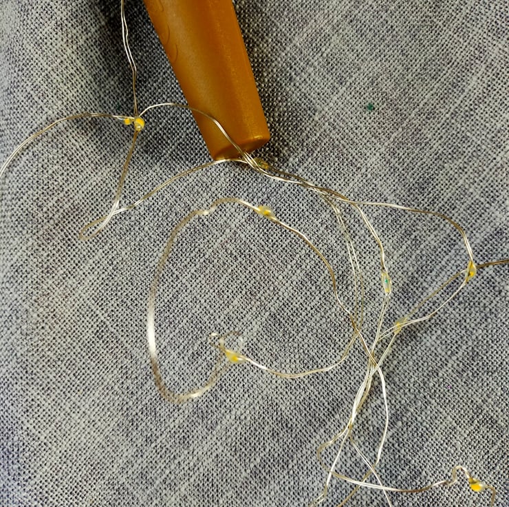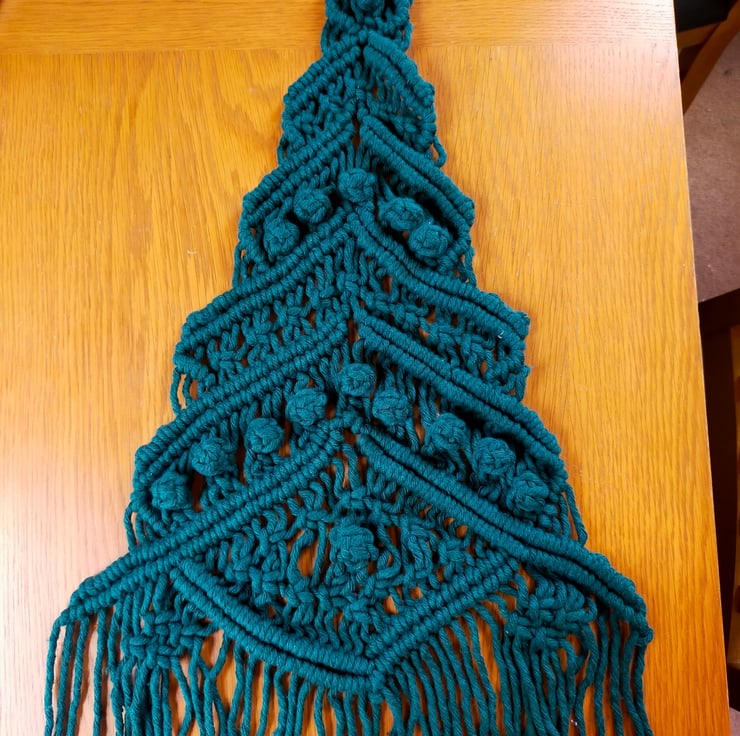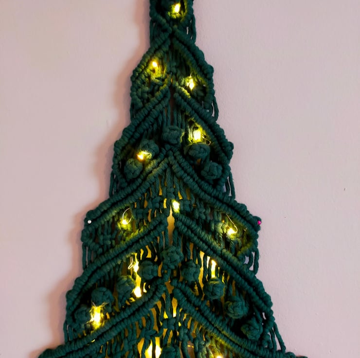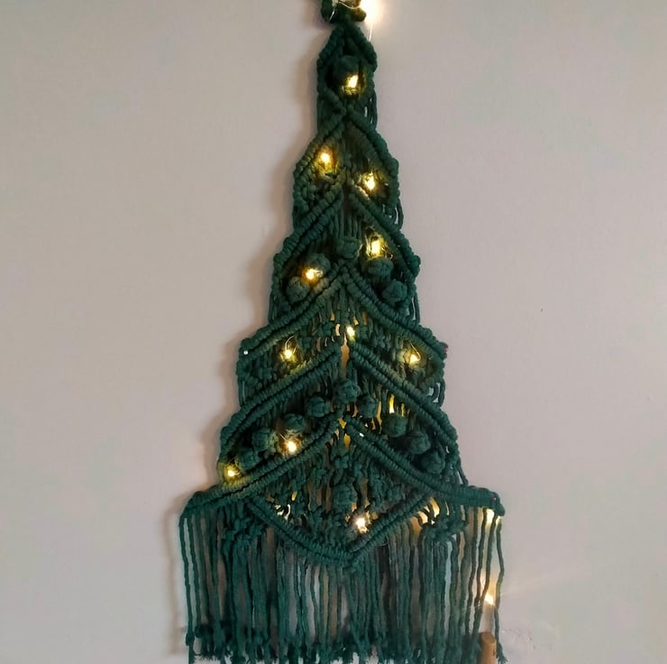 Dark green handmade Christmas tree, ideal for wall hanging. Comes with battery powered warm lights