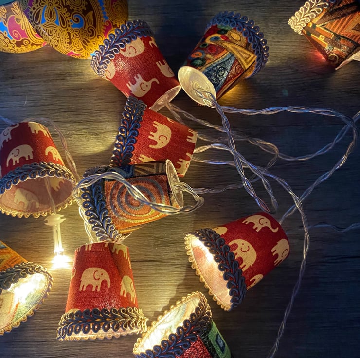 These mini lampshades are perfect to drape along a mantlepiece or shelf, around the head of a bed, or strung across a mirror.