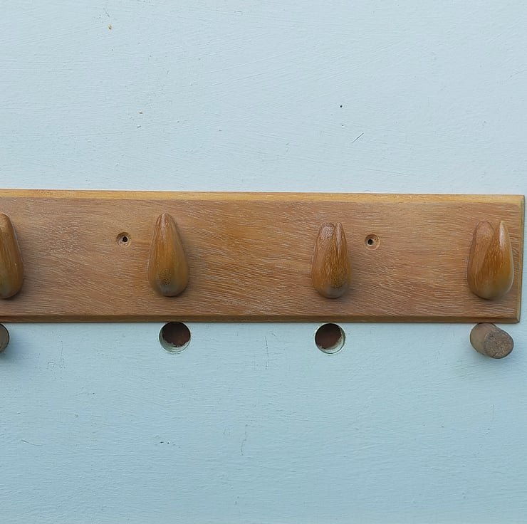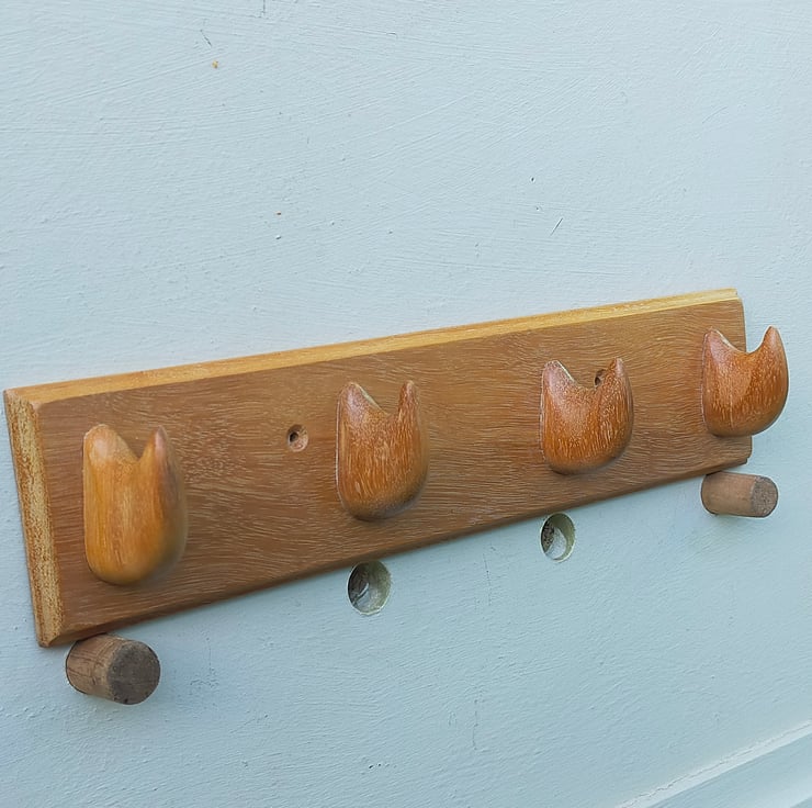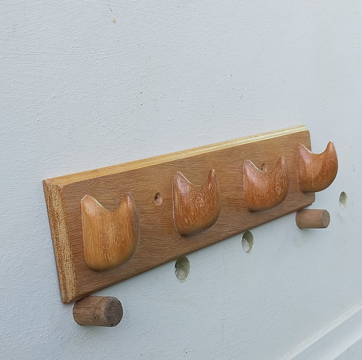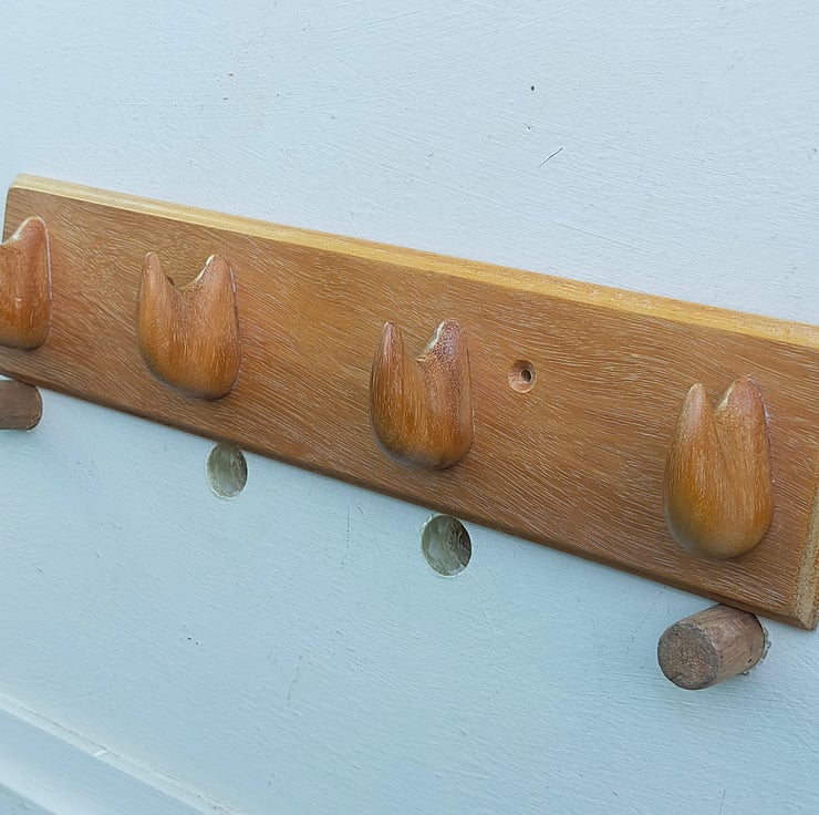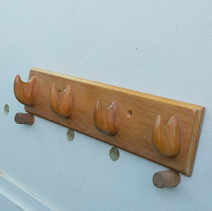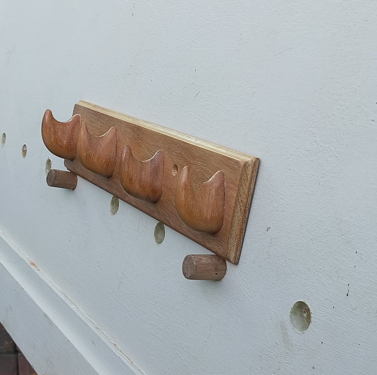 If you find that there seems to be an awful lot hanging on the back of your bedroom or bathroom door, then this is an elegant and stylish solution: four individually hand carved claws screwed and glued to a simple mahogany back plate, with two fixing holed to attach to the cross timber of any door, all hand sanded and wax polished to give a rich lustrous finish. As with all my work, the mahogany is reclaimed and has had a previous life; time for it to have a second life as an object of use and beauty!