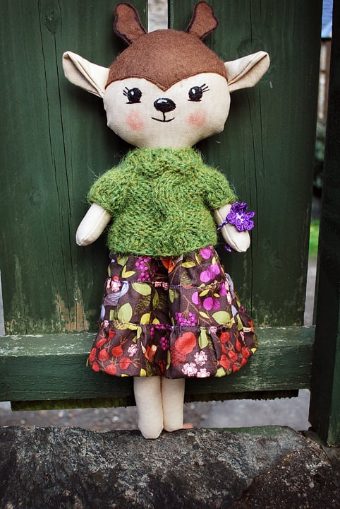 Honey's sweater is hand knitted out of soft pure alpaca wool with cable pattern. The skirt is made of soft cotton fabric with beautiful pattern.