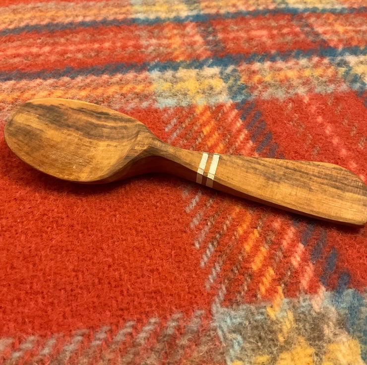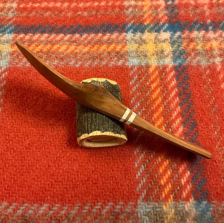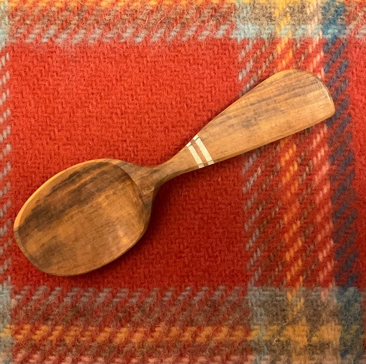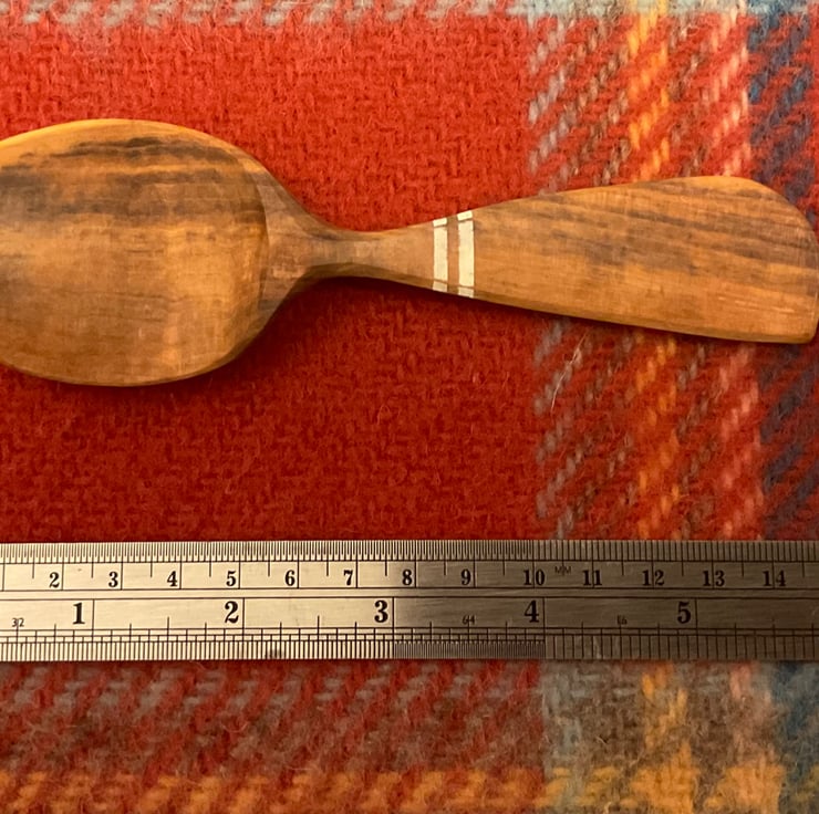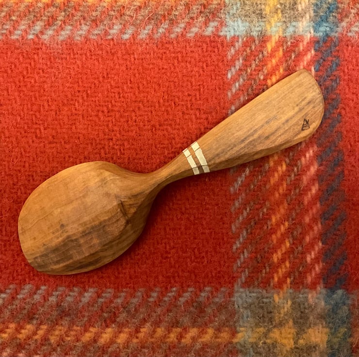 The spoon has been made from a freshly cut log, taken to its final shape using traditional methods- splitting the log firstly into a 'blank', drawing a rough shape before axing out and then finalising the shape using an array of knives. This leaves beautiful cut facets which mean no sanding is required. After drying, the spoon received a final shaping by knife and two white stripes painted in milk paint to contrast the wood tones. The spoon is then burnished using a smooth Scottish pebble leaving a silky feeling to the wood. Finally the wood is sealed using organic food grade linseed oil.