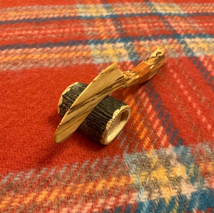 Hand made using traditional tools including axe, knife and drawknife. This spreader has been split from a fresh beech log, the shape drawn on, before being axed out and then finish carved by knife. Thus, the finished item shows the lovely smooth facets from these sharp tools and no sanding is used. The stunning handle colour is applied using food safe milk paint, and then the wood grain and milk paint is enhanced and sealed using organic food grade linseed oil. My elf hat makers logo is also burned into the handle. The log used for making the spreader, was locally sourced from an arborist.