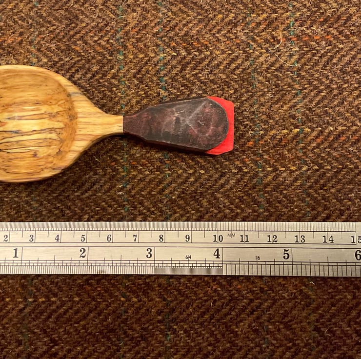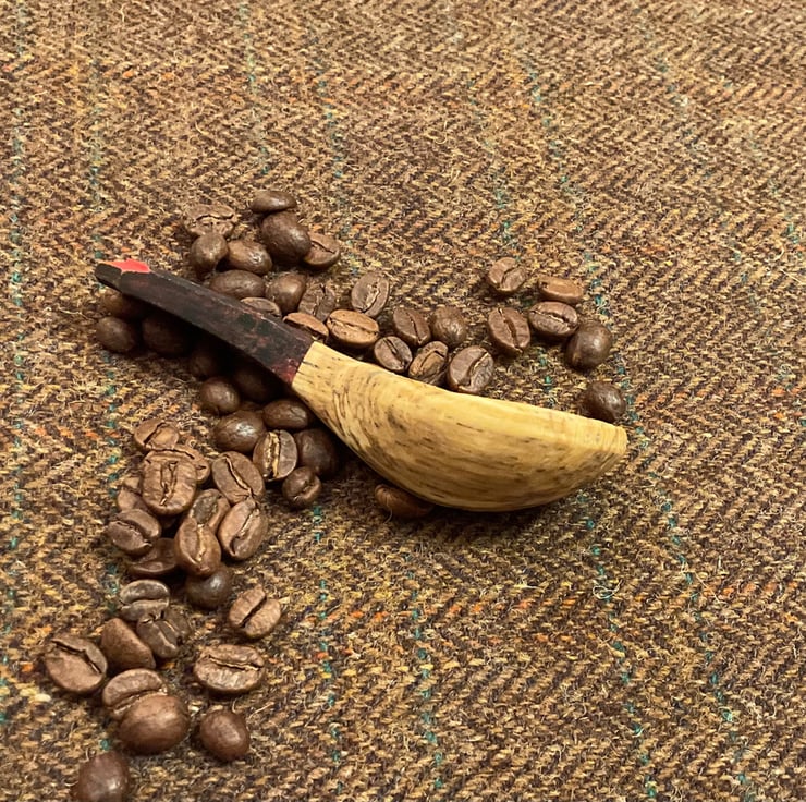 A striking spalted beech wood scoop with a black on red milk painted handle and a relief cut handle end revealing the bright red. A very slightly rounded measure with this scoop is 1 Tbsp- perfect for coffee, loose tea, sugar or similar. Heap even more for more caffeine!