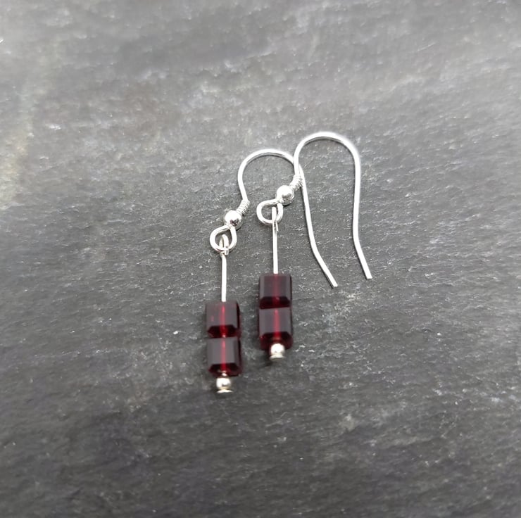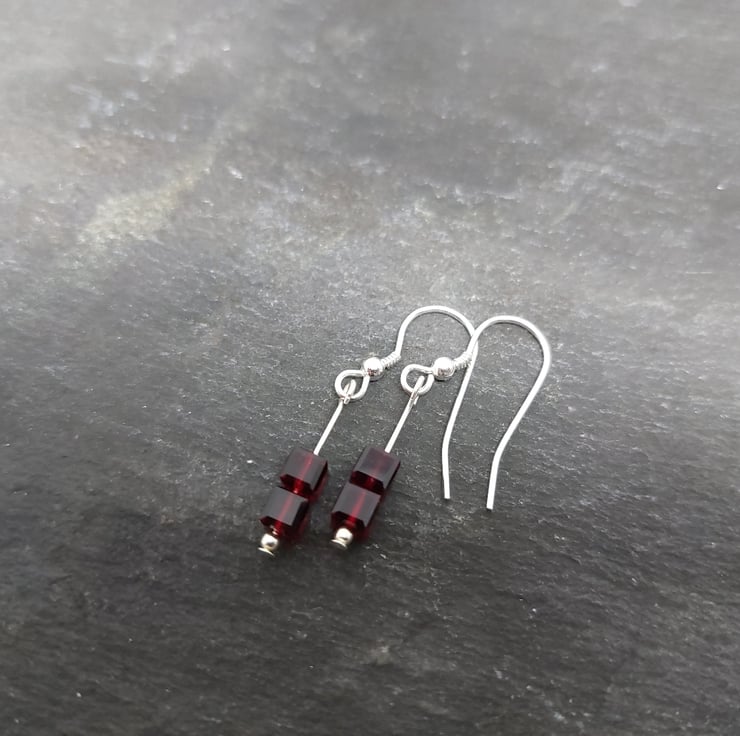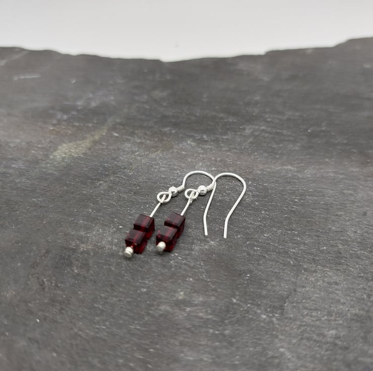 These earrings are made using sterling silver and Swarovski Crystal beads. This pair of earrings is made with Ruby Red 4mm square Swarovski Crystal beads. The crystal beads are hung on a sterling silver head pin and attached to a sterling silver ear hook.
