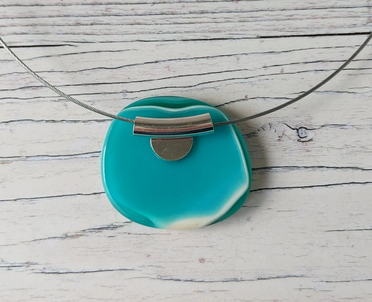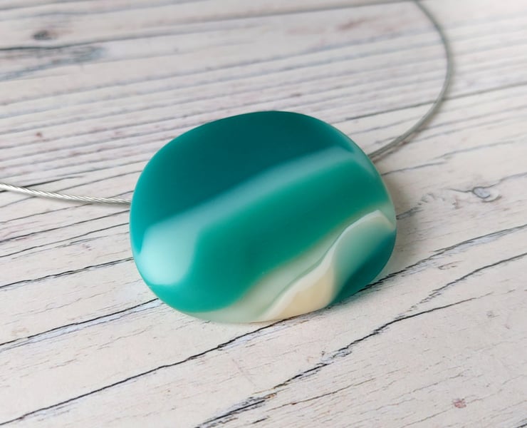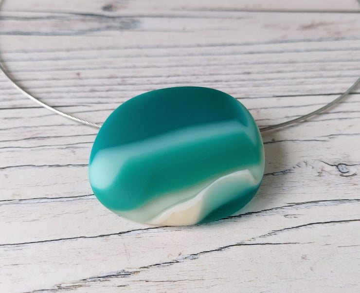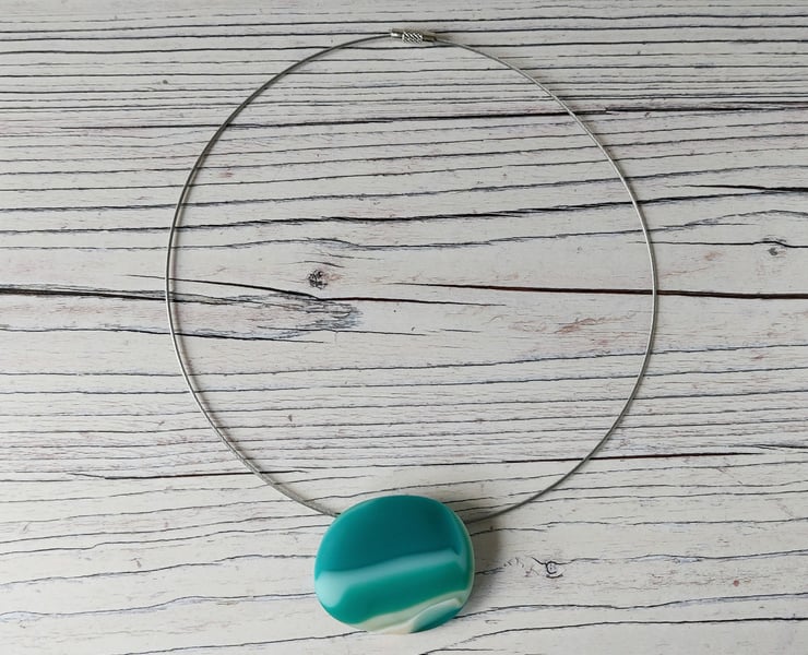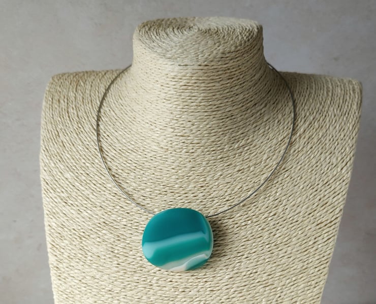 This large teal and aquamarine striped fused glass pendant has an irresistibly tactile matt surface just like a sea smoothed pebble. The curved 'invisible' bail and unobtrusive wire choker means that the pendant almost appears to float - it's a very neat look.