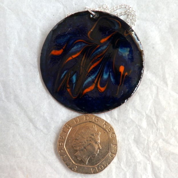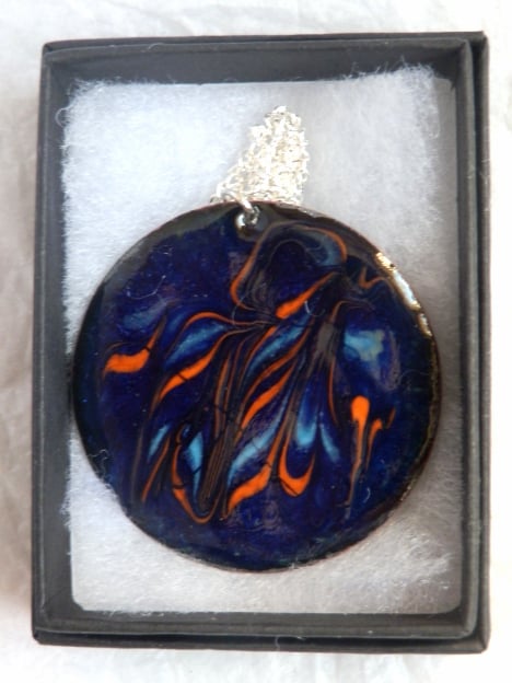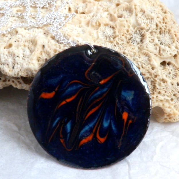 I have scrolled fragments of orange and pale blue rod over the blue dark background layer of enamel. I built up the dark blue over several layers of clear enamel and in some lights the copper base may be seen, shimmering silver, through the blue.