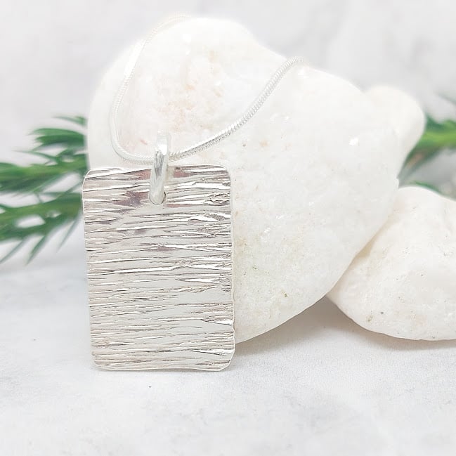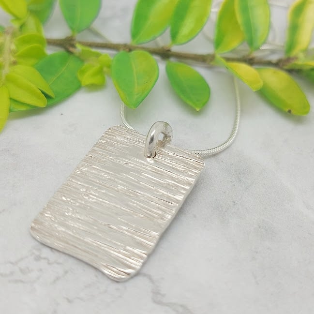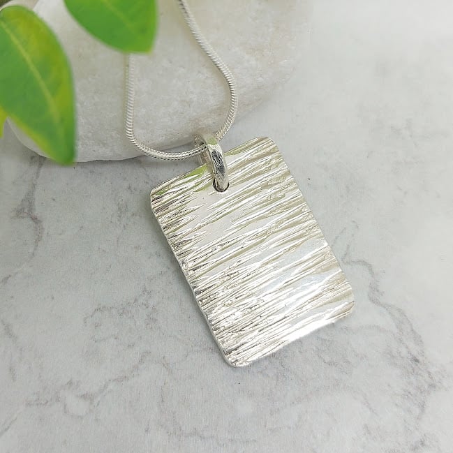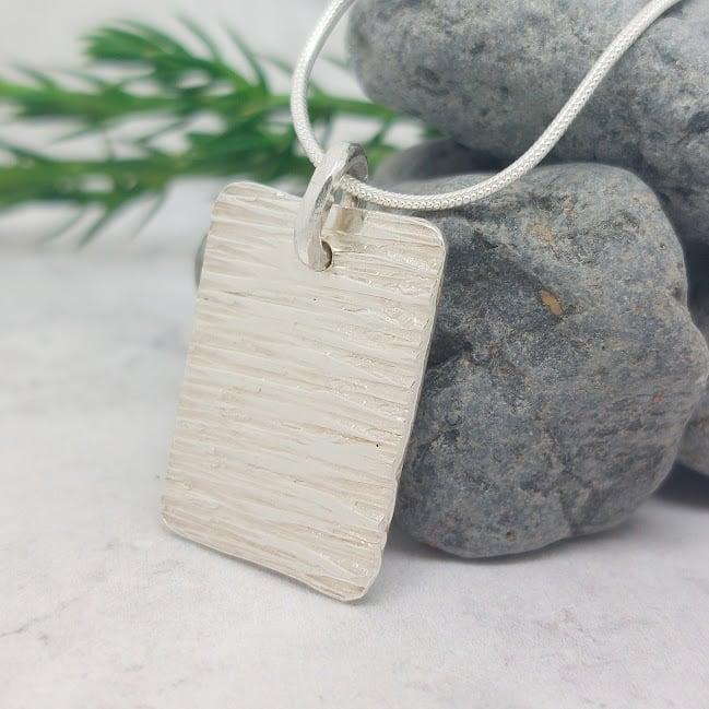 This pendant has been made using 1mm thick sterling silver sheet. Having cut the silver sheet the texture is applied using a texturing hammer. On this particular pendant I have textured with a line effect. As each piece is made by hand, each piece is truly unique.