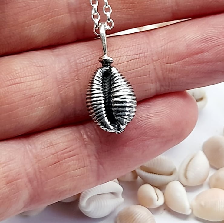 A lovely oxidised textured Silver cowrie shell pendant in solid sterling silver. The shell measures 13 mm in length and including bail 18-20 mm. This has been moulded from a real shell found on an Orkney beach on on a small Orkney island called Little Linga. Heavy weight but delicate at the same time. Supplied on an 17 inch belcher chain (see close up in gallery). Please specify at checkout if a different length is required. For a guide to chain length see photo below. But please note that this is just a rough guide as it depends on size of the individual neck where pendant hangs.