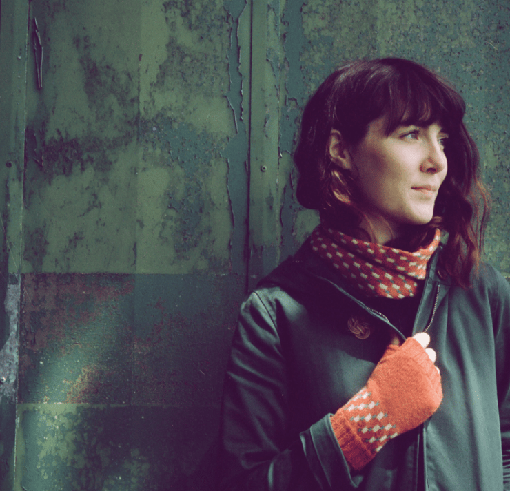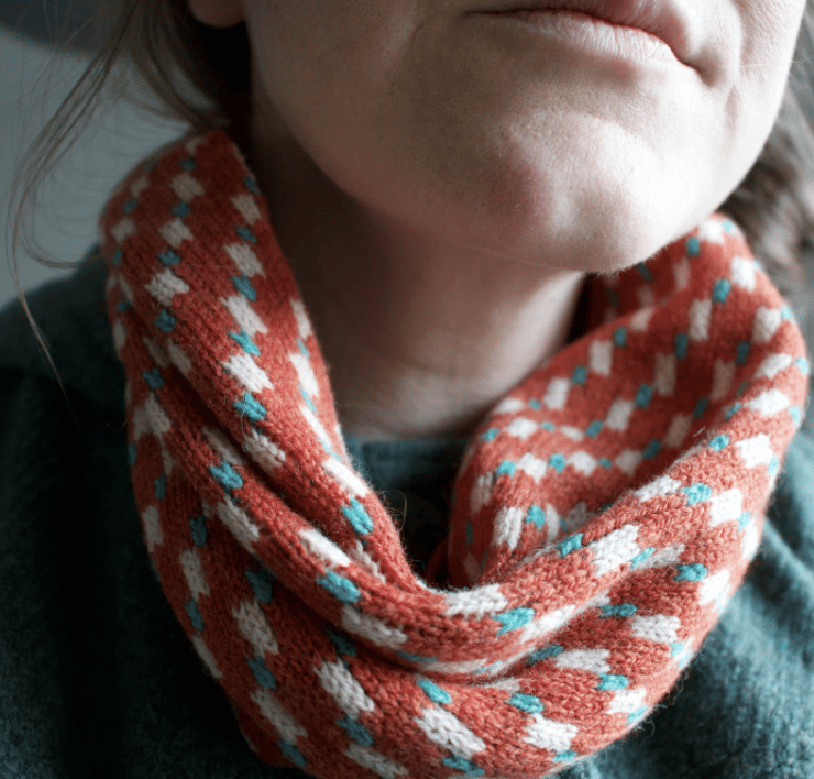 This snood is knitted in a copper inspired colour palette of Rust, Oatmeal and Emerald.