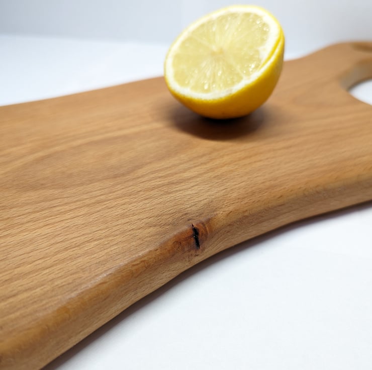 It is 20mm thick, approximately 18cm wide and 41cm long including the ergonomic handle complete with hanging hole. All crafted from a single piece of high quality beech and finished with 3 coats of pure tung oil to give a subtle sheen but also protect the wood.