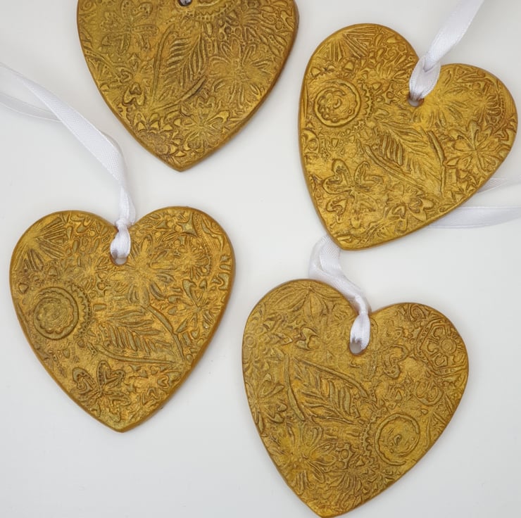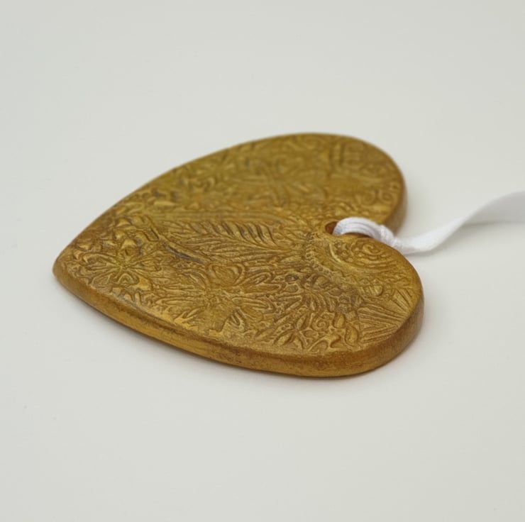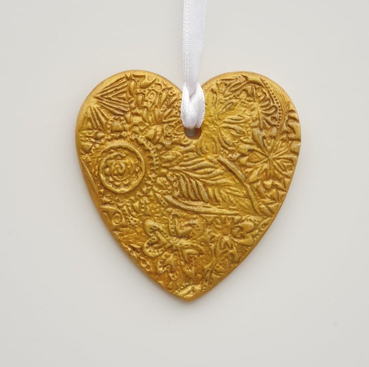 Gorgeous gold heart which has been lovingly made from air dry clay and has then been embossed with a floral pattern on both sides. This pretty hanging heart has been handpainted with gold acrylic paint and varnished for protection. Perfect for adding to your home decor all year around or would make a lovely little present for a golden wedding. They would also look great hung on a Christmas tree. The pretty heart comes ready to hang with white satin ribbon. Perfect as a gift it comes packaged in a pretty organza bag finished with ribbon.