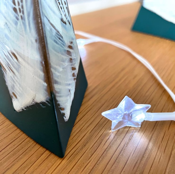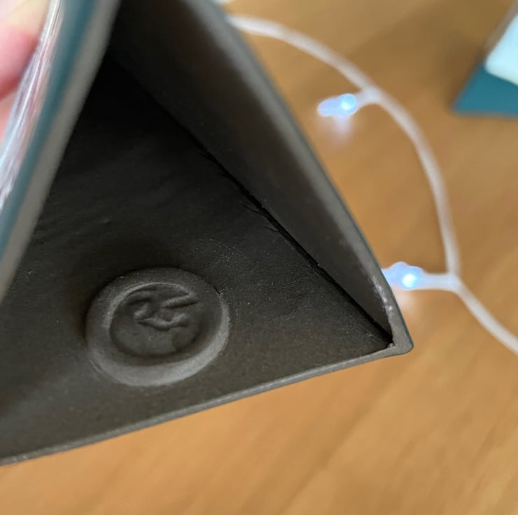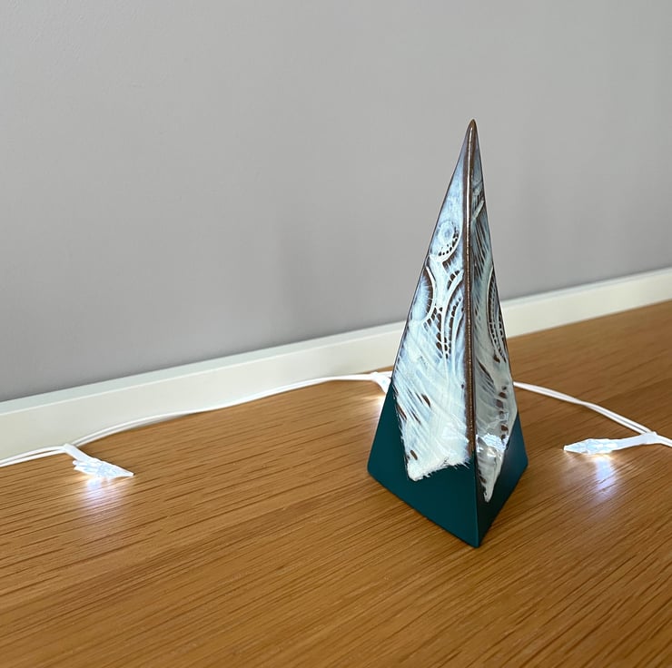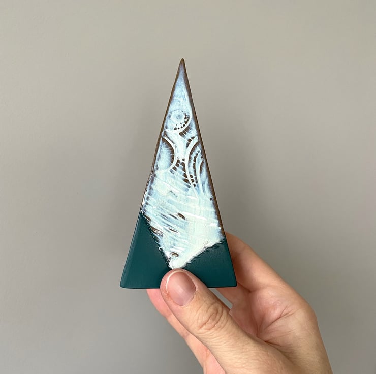 Designed as a decorative object for the festive season but there’s no reason why it couldn’t be displayed all year round. Made with thin sheets of grey stoneware clay, imprinted with an abstract pattern. My maker’s mark is printed on a button of clay inside each piece.