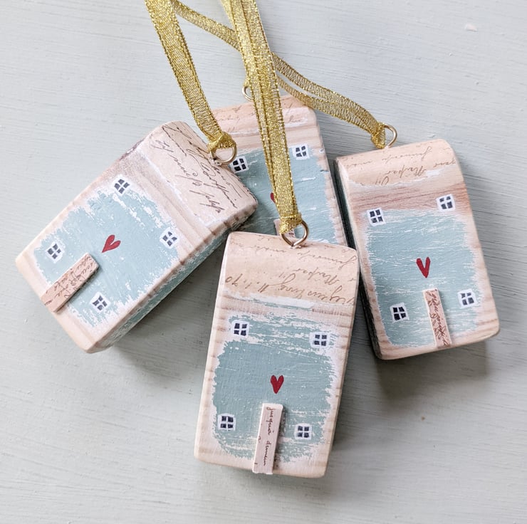 Hand painted with teeny windows and doors these one of a kind houses hang on gold ribbon.