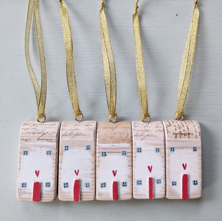 Hand painted with teeny windows and doors these one of a kind houses hang on gold ribbon.
