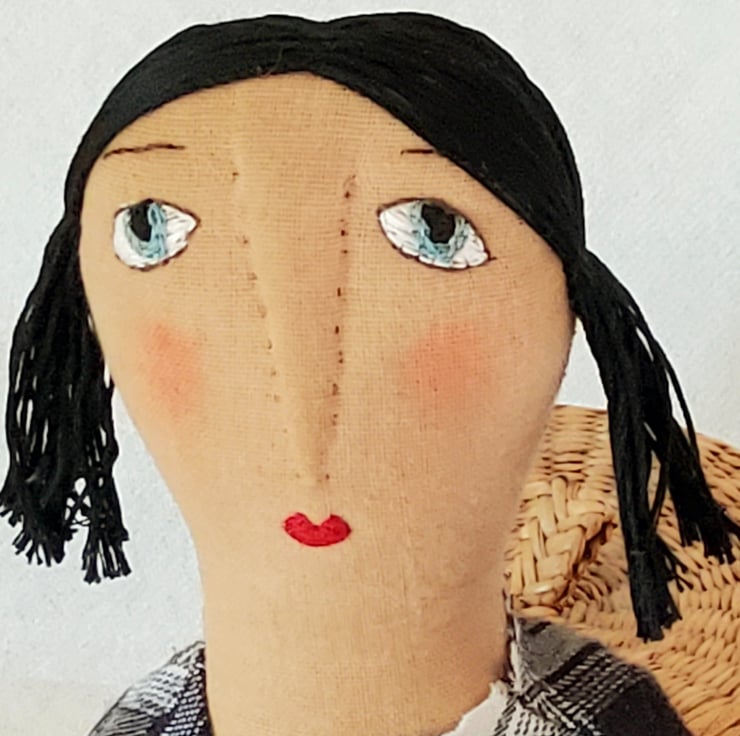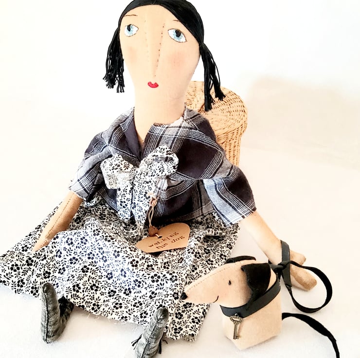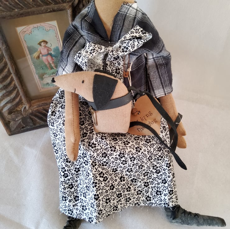 They are made from coffee and cinnamon dyed Osnaburg fabric, sanded back for a primitive aged look. They have embroidered features and flushed cheeks. She has embroidery thread hair. Dog has felt ears and tail ,a leather collar and lead and has a tiny key on his collar. Her clothes are a cotton skirt and a brushed cotton shirt- she has painted on boots with embroidery thread 'laces'.she has jointed legs so that they would hang over the edge of a shelf ( her arms have had the same treatment so that they can be put in different positions.