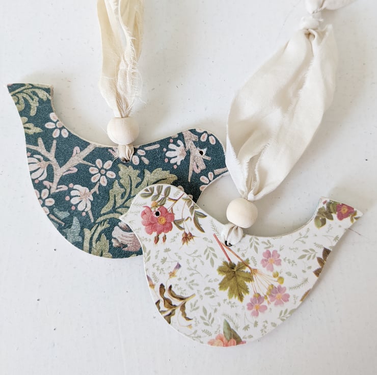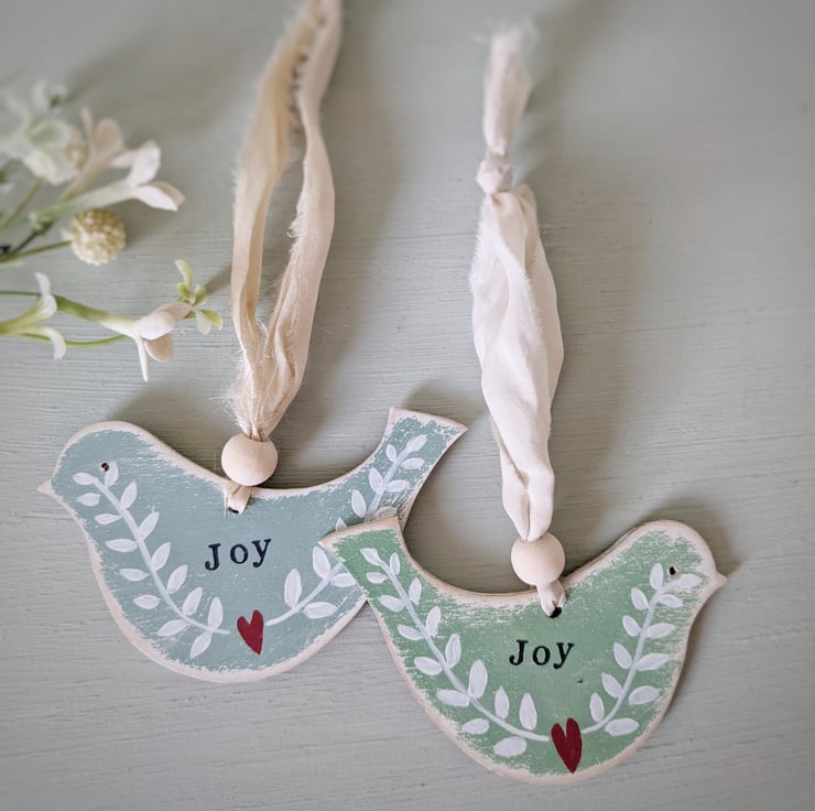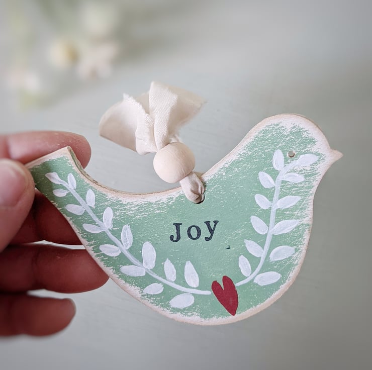 Hand painted with pretty leaf motif and stamped words this one of a kind bird hangs with silk ribbon and a wooden bead.