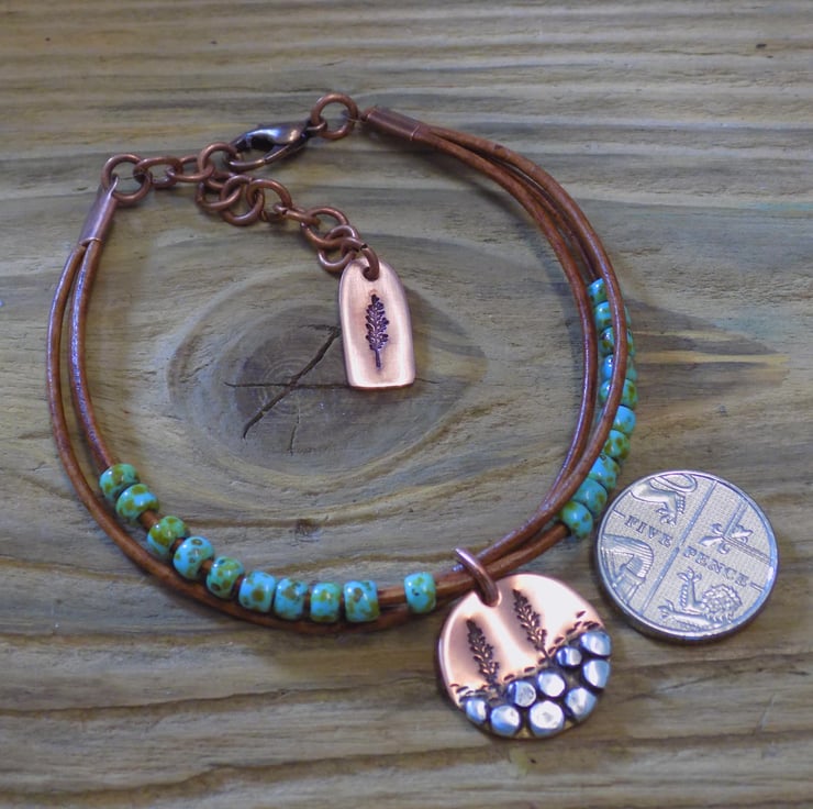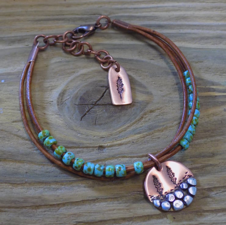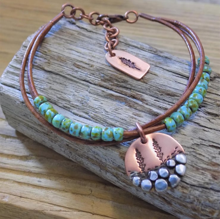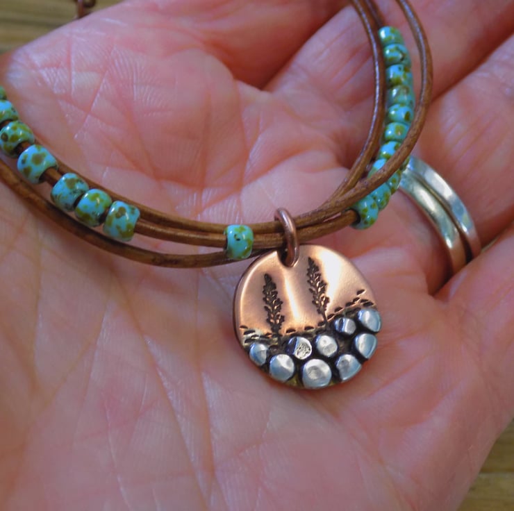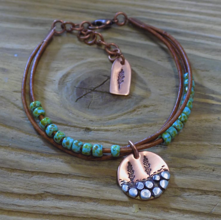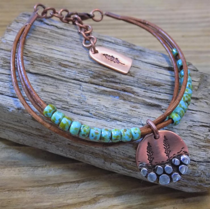 A bracelet made from vintage leather cord with gorgeous Picasso toho beads threaded onto it for some colour and movement. The focal charm is made from copper with sterling silver 'rocks' each individually formed and soldered on. A couple of trees have been added , also another tree features on a cute copper tag at the end of the extension chain. Length form 6.5 -8 inches.