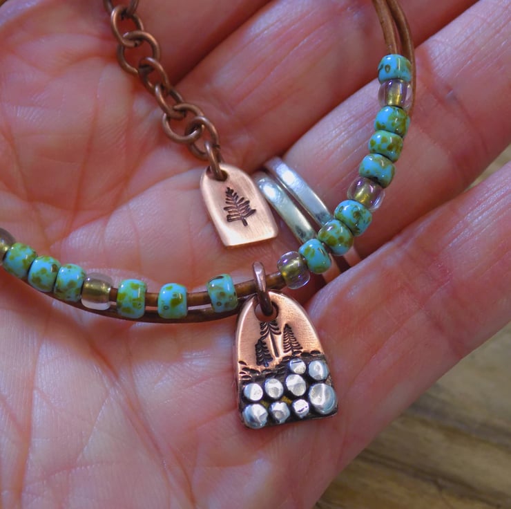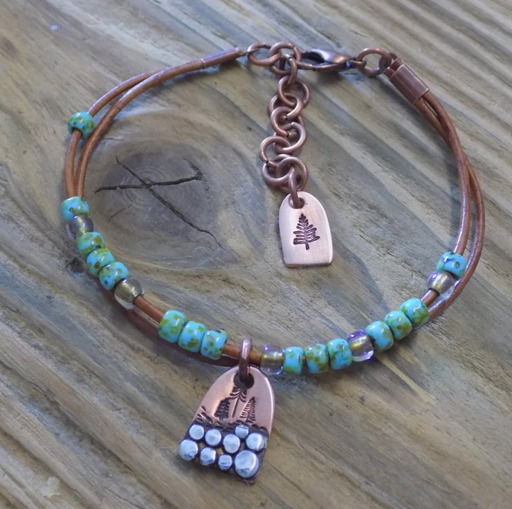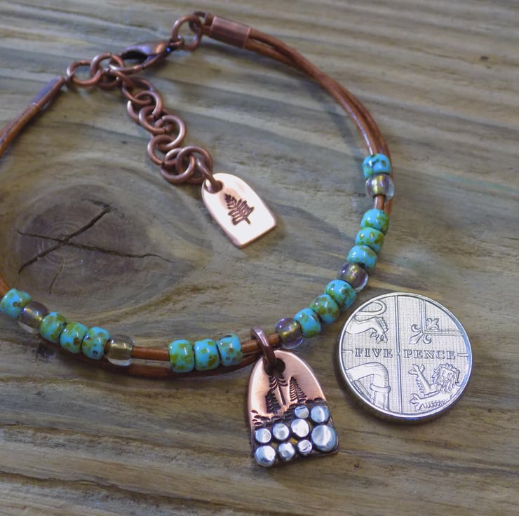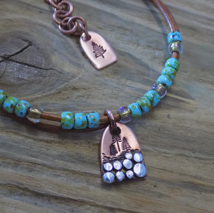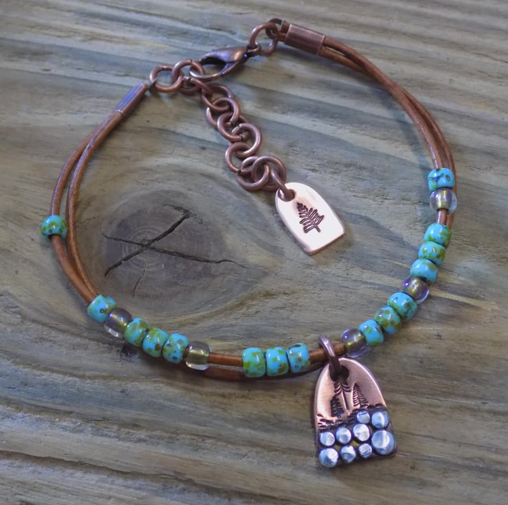 A bracelet made from vintage leather cord with gorgeous Picasso toho beads threaded onto it for some colour and movement. The focal charm is made from copper with sterling silver 'rocks' each individually formed and soldered on. A group of alpine trees have been added , also another tree features on a cute copper tag at the end of the extension chain. Length form 6.5 -8 inches.
