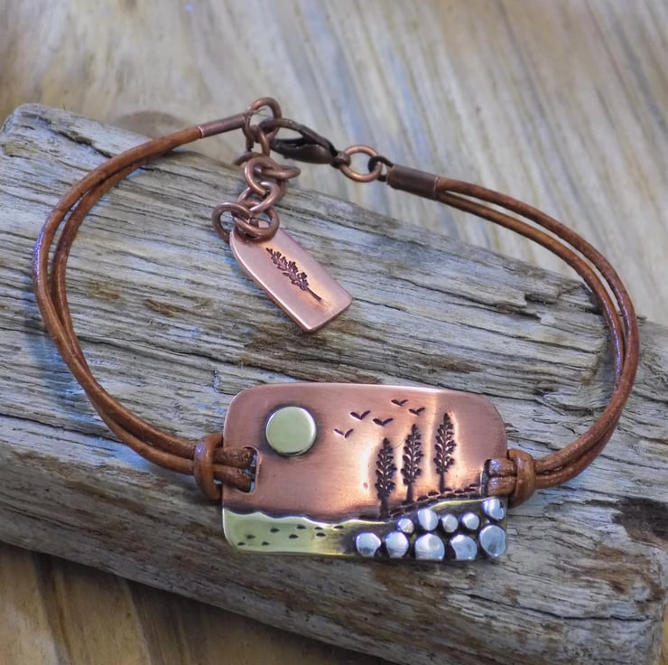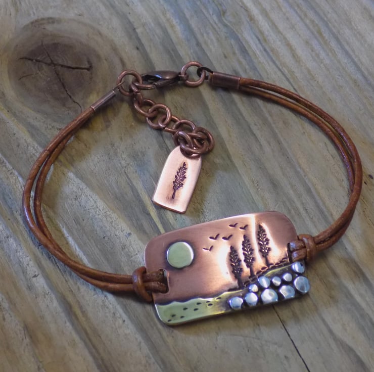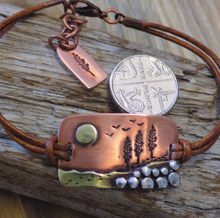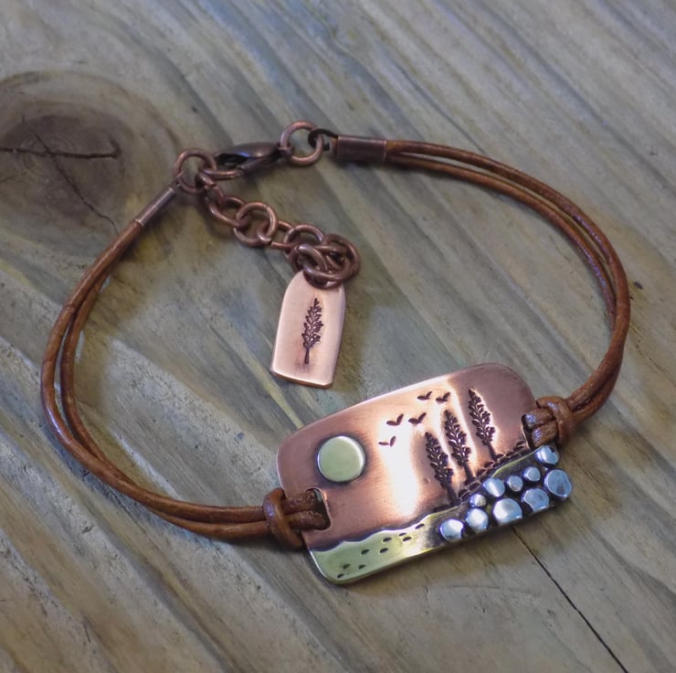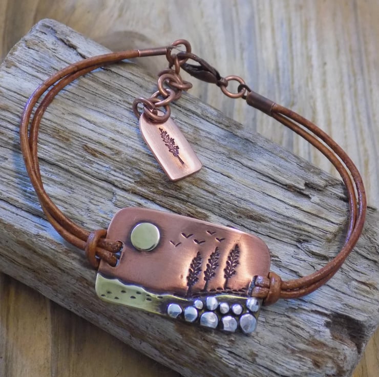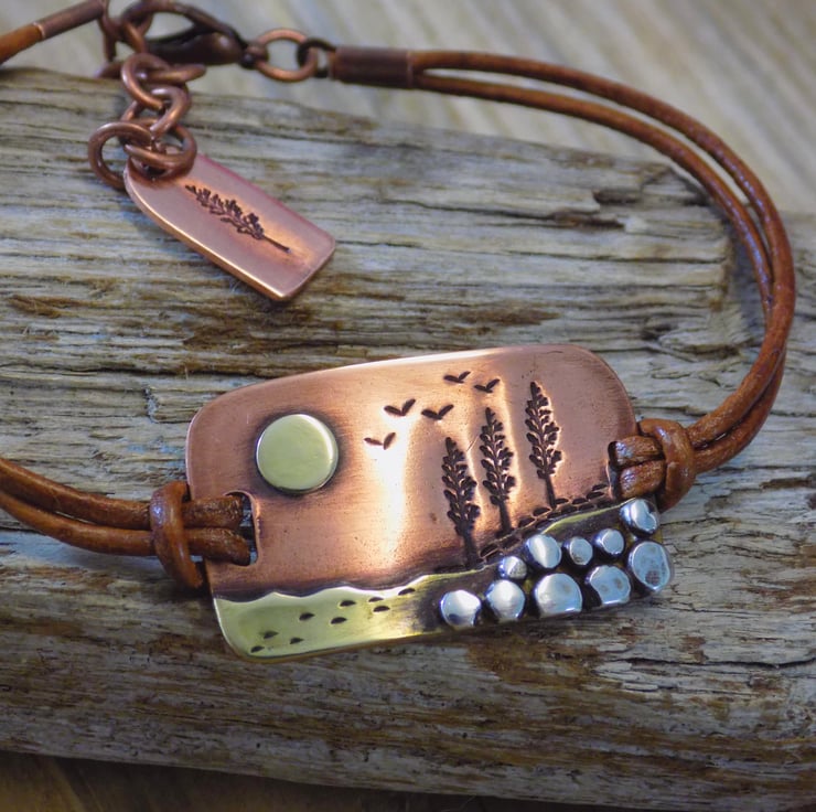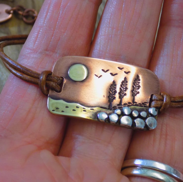 A bracelet made from vintage leather cord featuring a gorgeous mixed metal focal. The copper centre piece has a layer of brass and silver rocks to the right , each one made individually and soldered on, above the rocks a small line of trees have been added, lastly a big brass sun and a flock of birds sets the scene. Another tree features on a cute copper tag at the end of the extension chain. Length form 6.7 -8 inches.