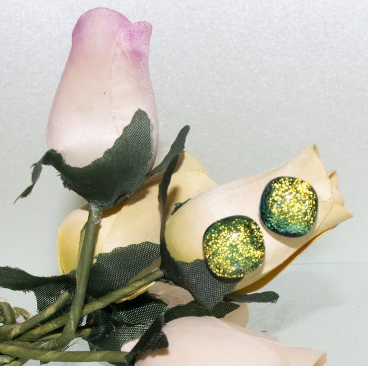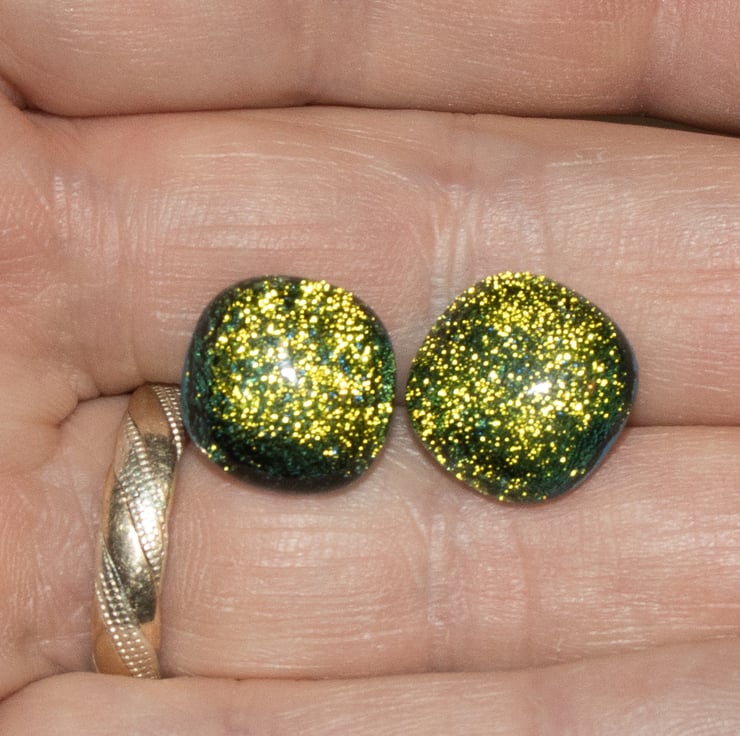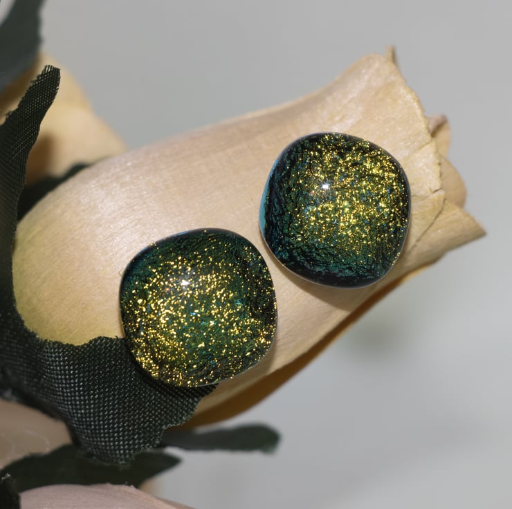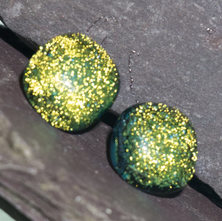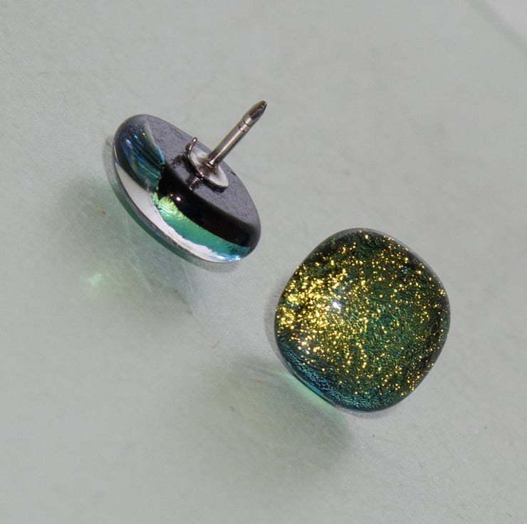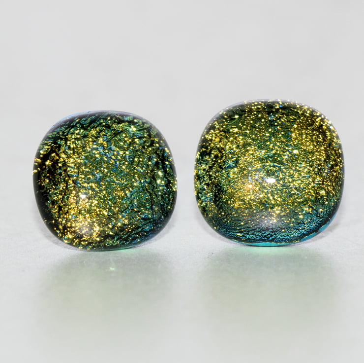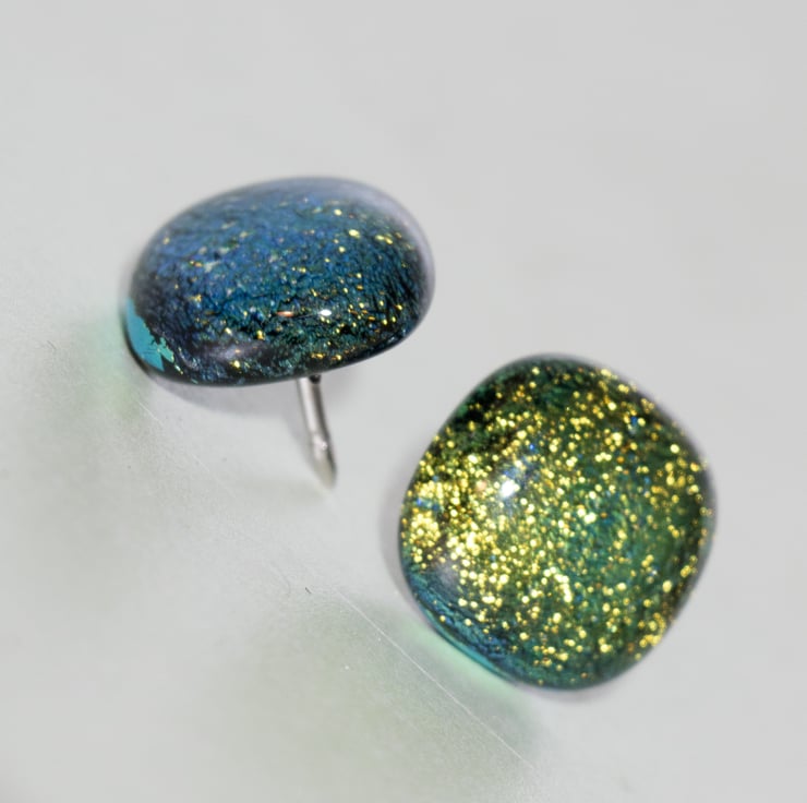 We have a range of earrings created from dichroic glass - we love working with it. The colours that Dichroic Glass show continues to amaze and surprise us. When we open the kiln we are always looking to see what the kiln-fairies have been up to.