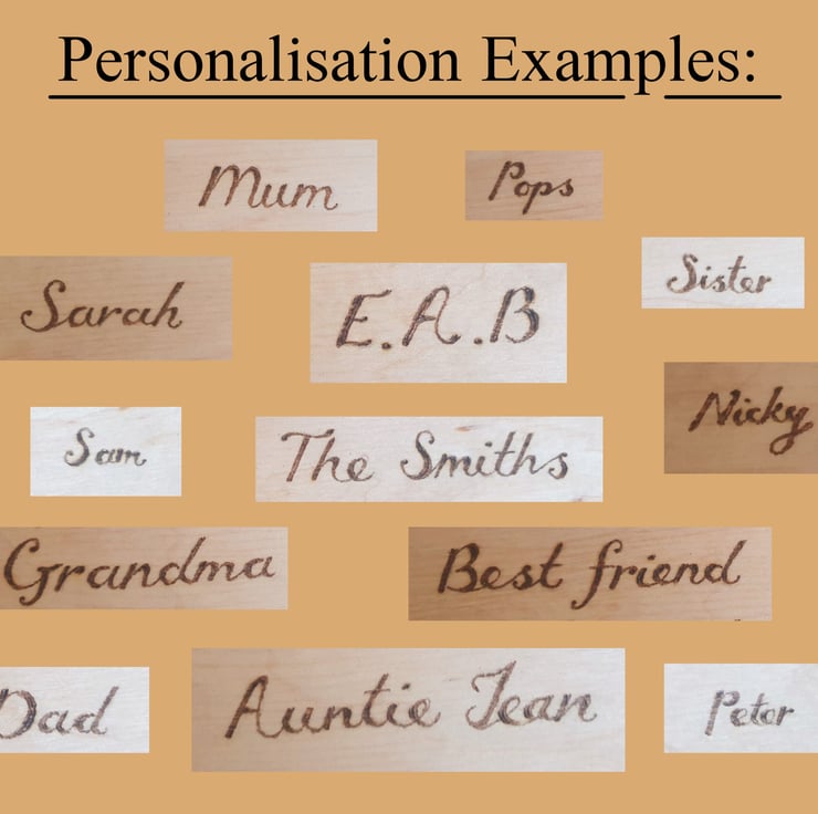 The design is carefully hand burnt into the wood using Pyrography, one line at a time (no lasers are used here) This Drawing with Fire technique ensures you are receiving a one-off piece as no two can be exactly the same. The design will not rub off or fade as it is burnt into the wood.