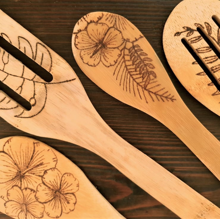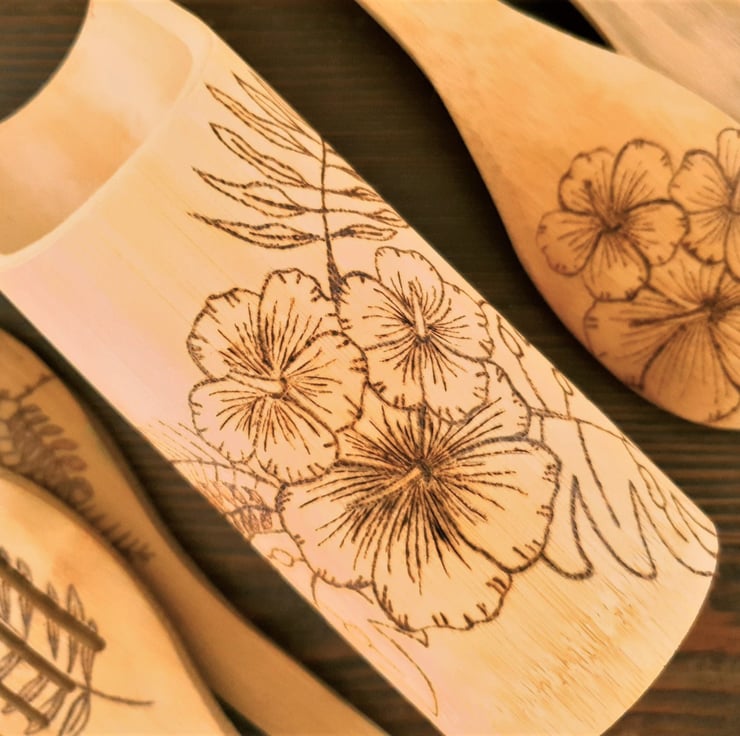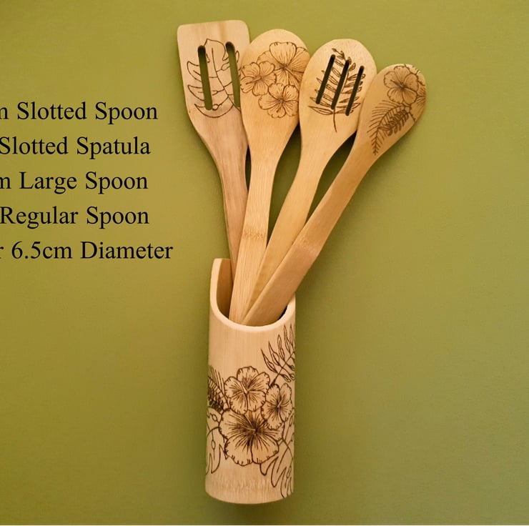 This Wooden Cooking Utensils Set combines beautiful Wood Burning Art and functional kitchenware. With a hibiscus flower design on both the holder and individual utensils, this intricate piece of art will be a talking point in any kitchen.