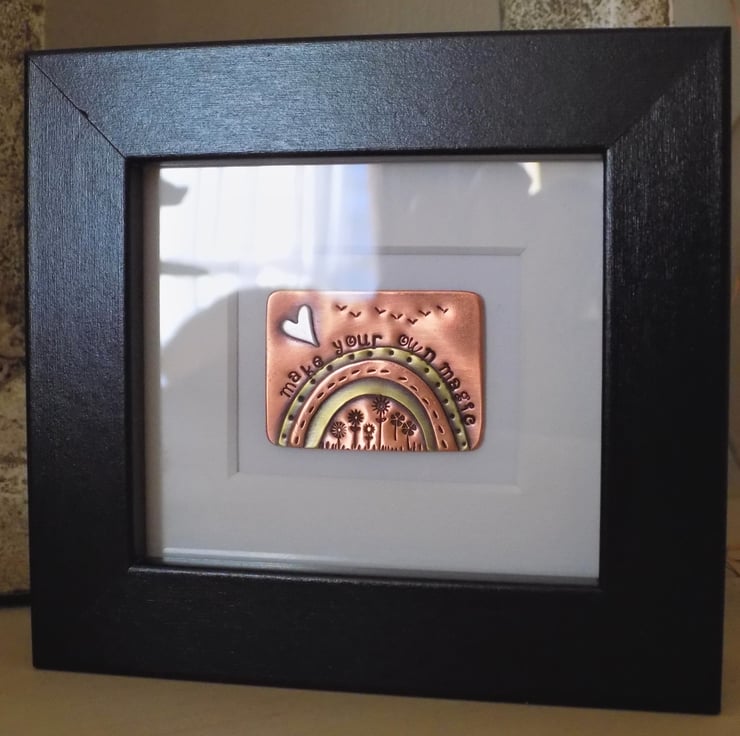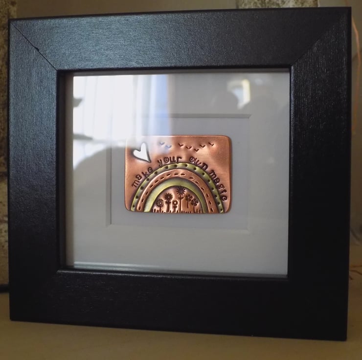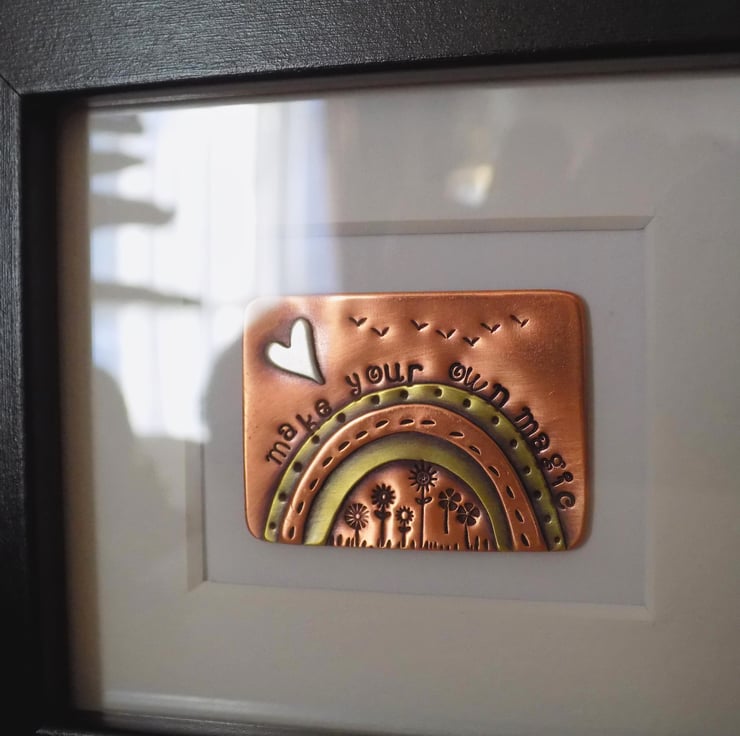 A lovely framed mixed metal miniature art work made from layers of copper and brass , featuring a rainbow with the words 'make your own magic' above it. Little stamped flowers have been added underneath and to make it extra special I've added a sterling silver love heart.