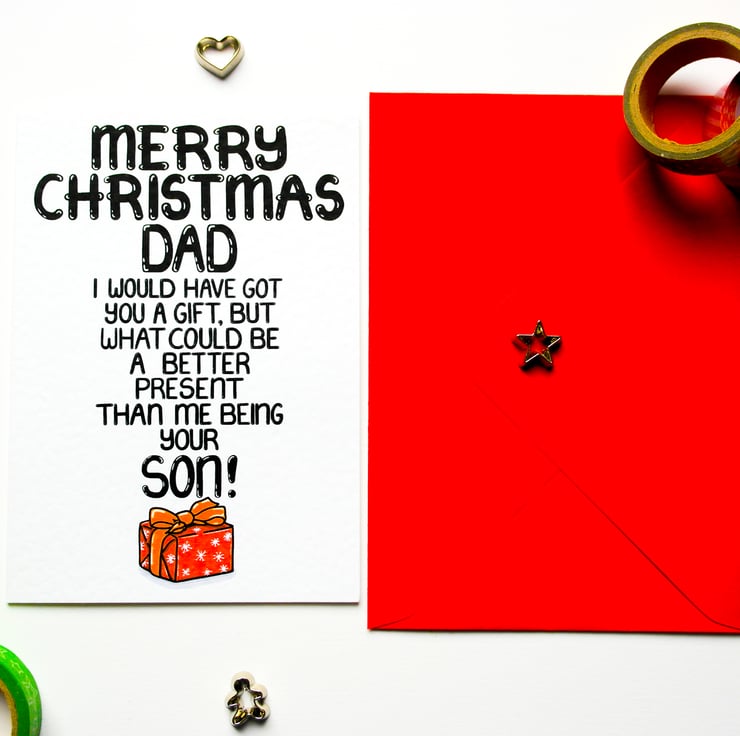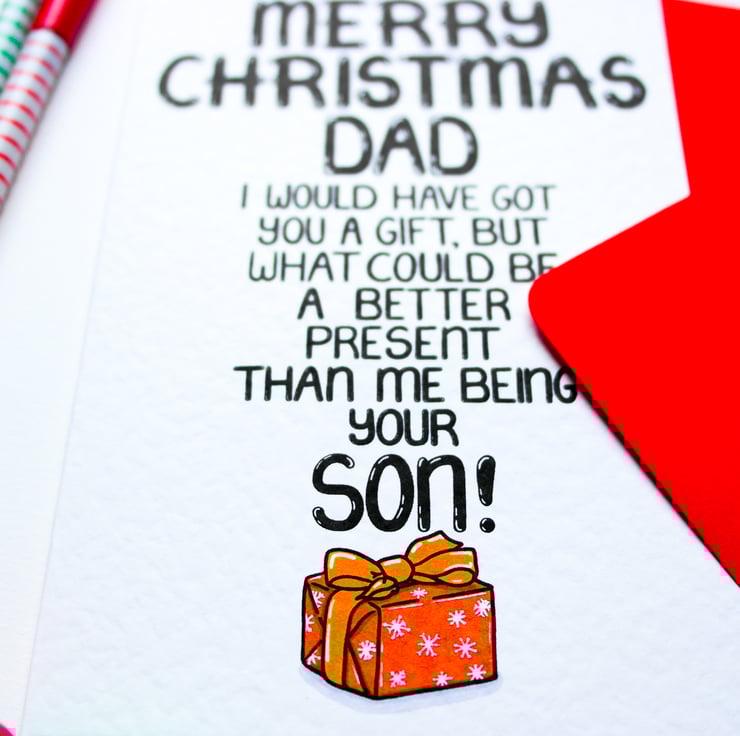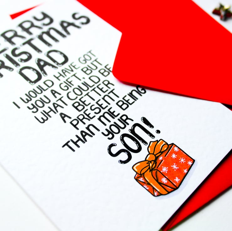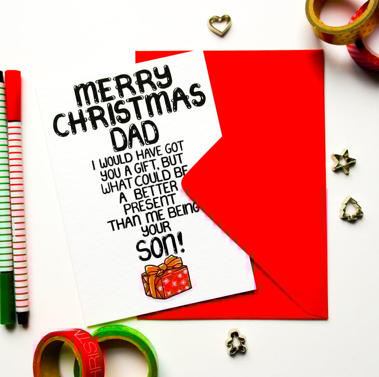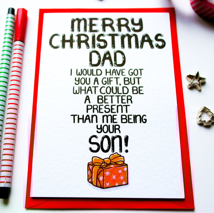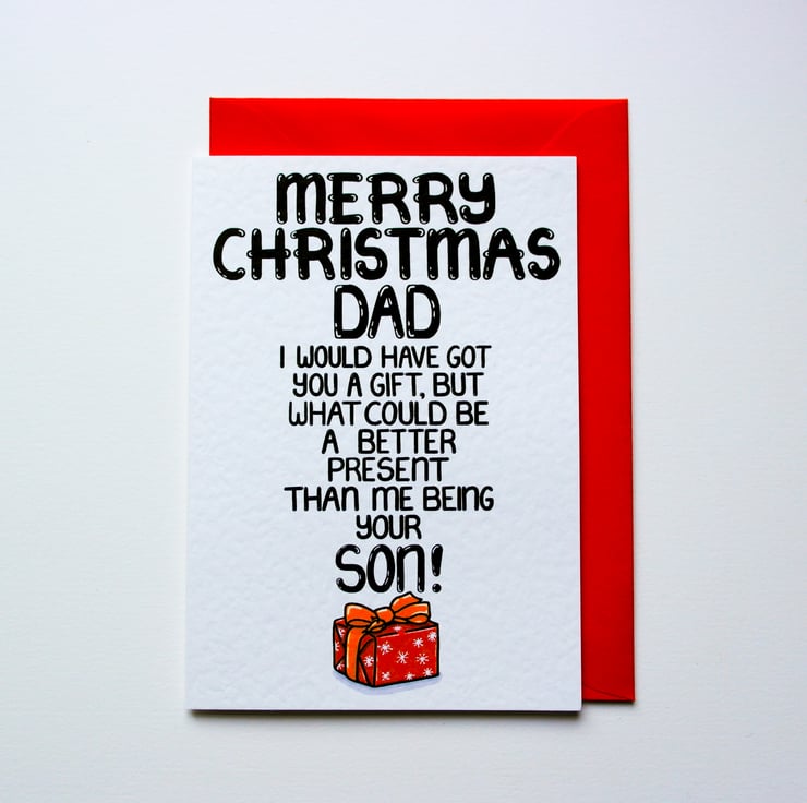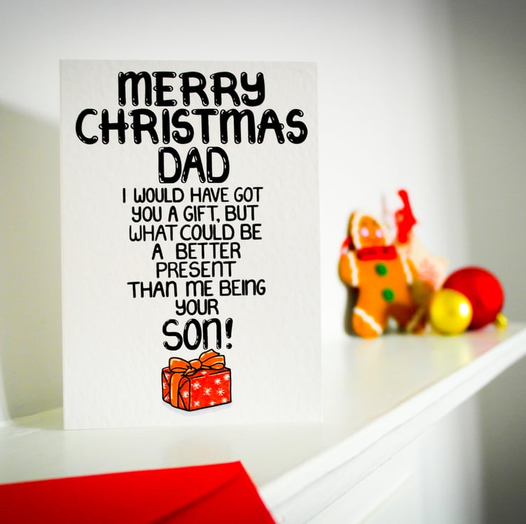 Greeting on front: MERRY CHRISTMAS DAD I WOULD HAVE GOT YOU A GIFT, BUT WHAT COULD BE A BETTER PRESENT THAN ME BEING YOUR SON!