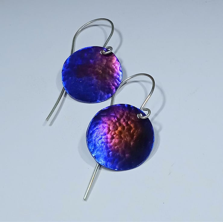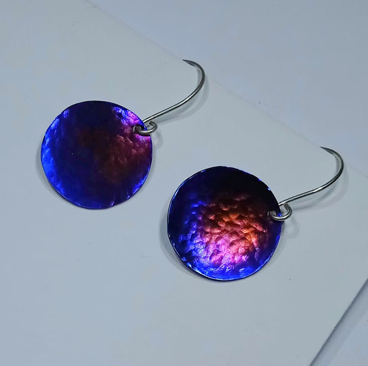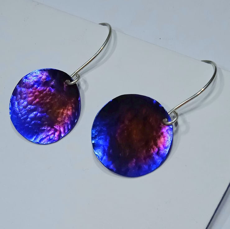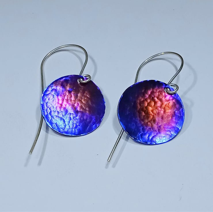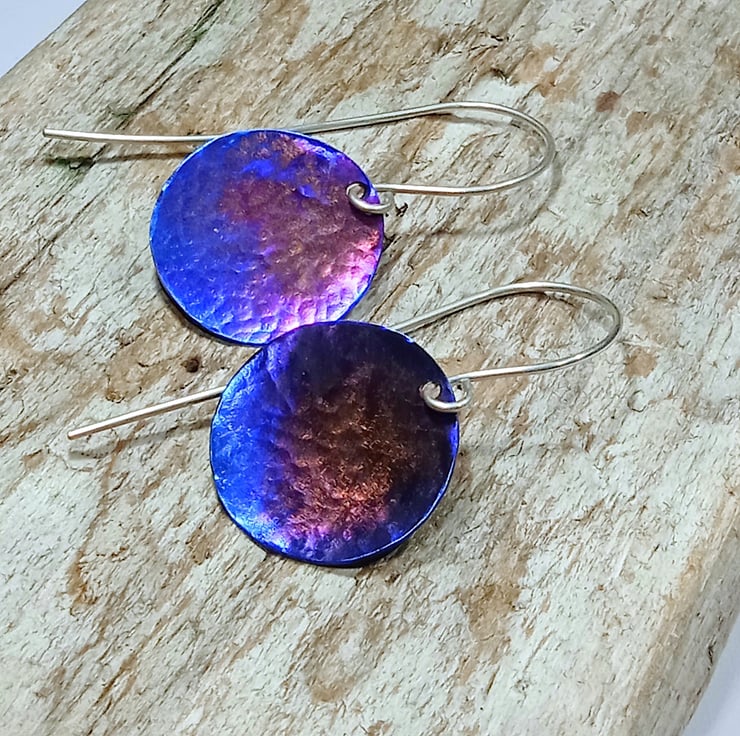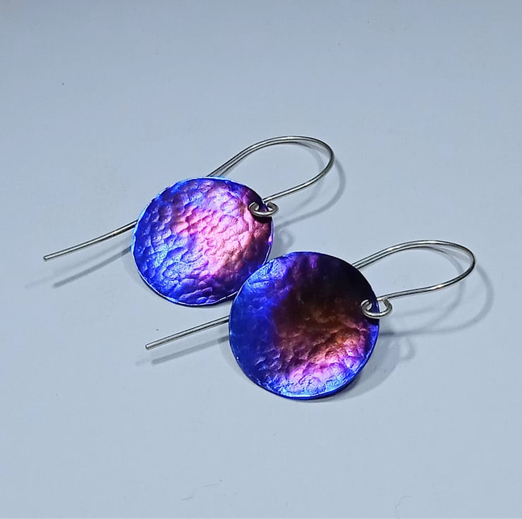 The titanium discs measure approximately 18.8 - 19.2 mm across and I have hung them from sterling silver earring wires which I have also hand made.