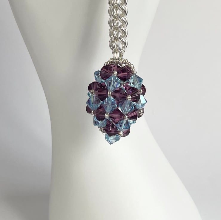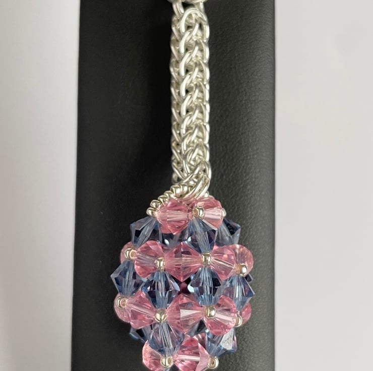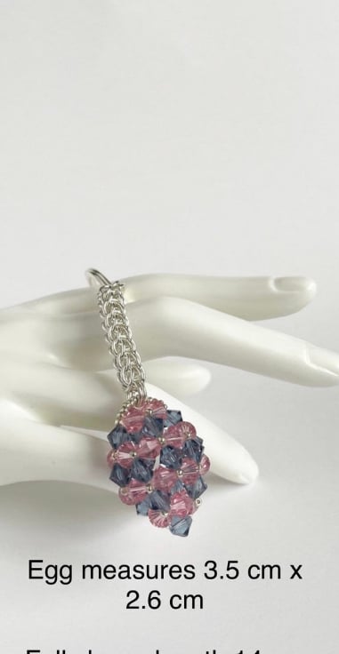 Pink and denim blue European Crystal bicones have been used to create this beautiful two coloured handmade shaped egg.