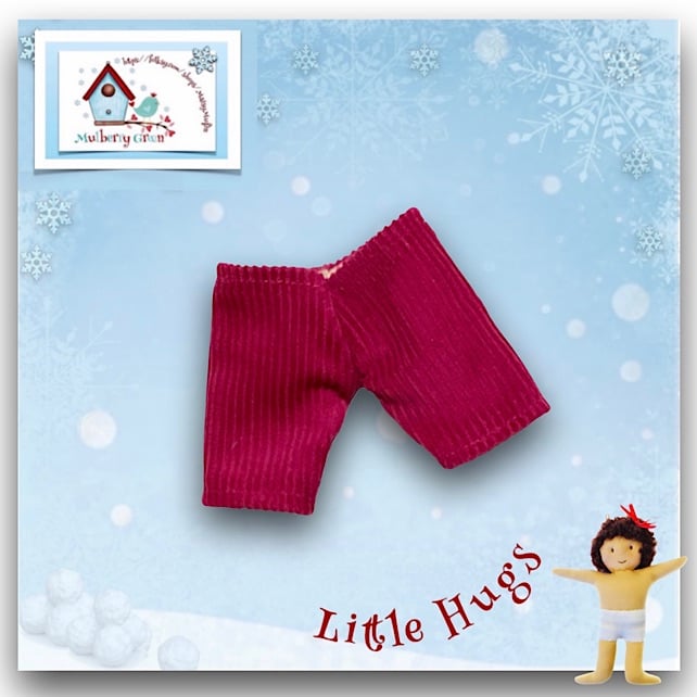 A cute little pair of raspberry cord trousers made to fit the Little Hugs dolls. They are fashioned just like grown up ones and are made from a lovely soft raspberry cotton cord.