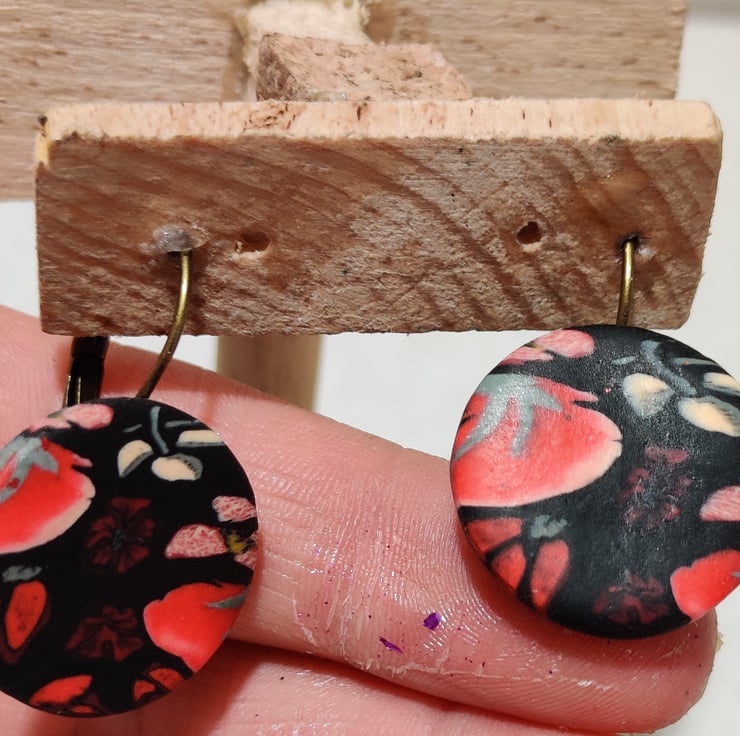 Hand made polymer clay earrings with a floral pattern.. lever back fixing which can be painted with hypoallergenic coating on request for free. Please see all photos for close up detail. All products handmade therefore there may be minor imperfections. Each pair sold as seen, message for more