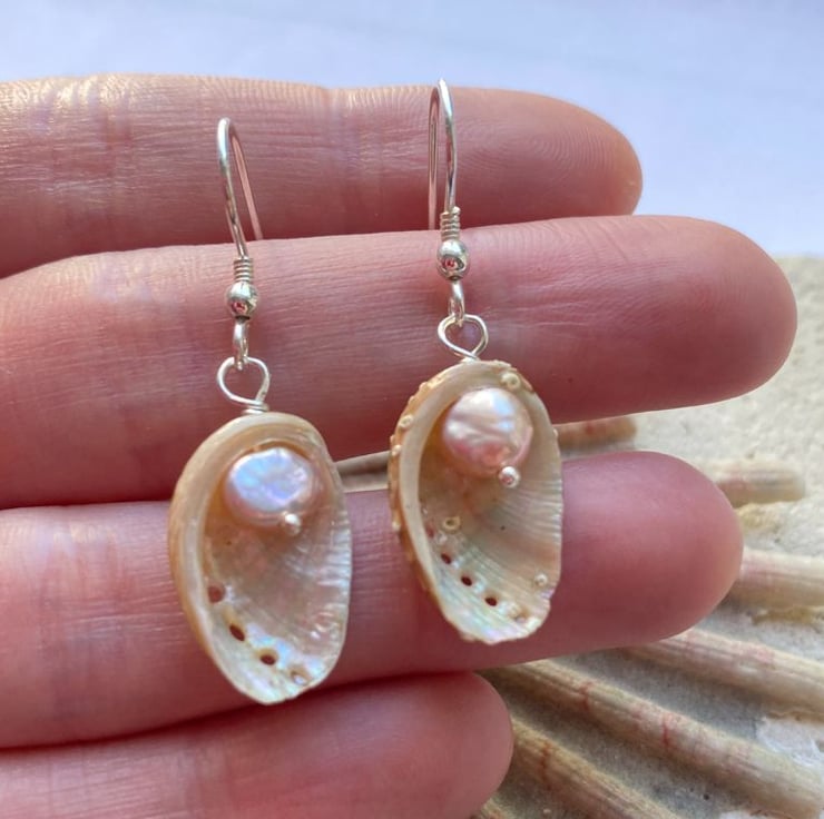 Delightful little Ormer Shell hook earrings. Each shell has a freshwater pearl accent, to bring out the beautiful natural colours of the shell.