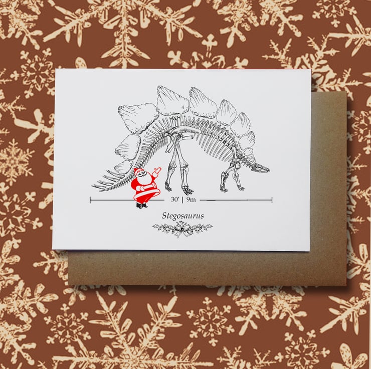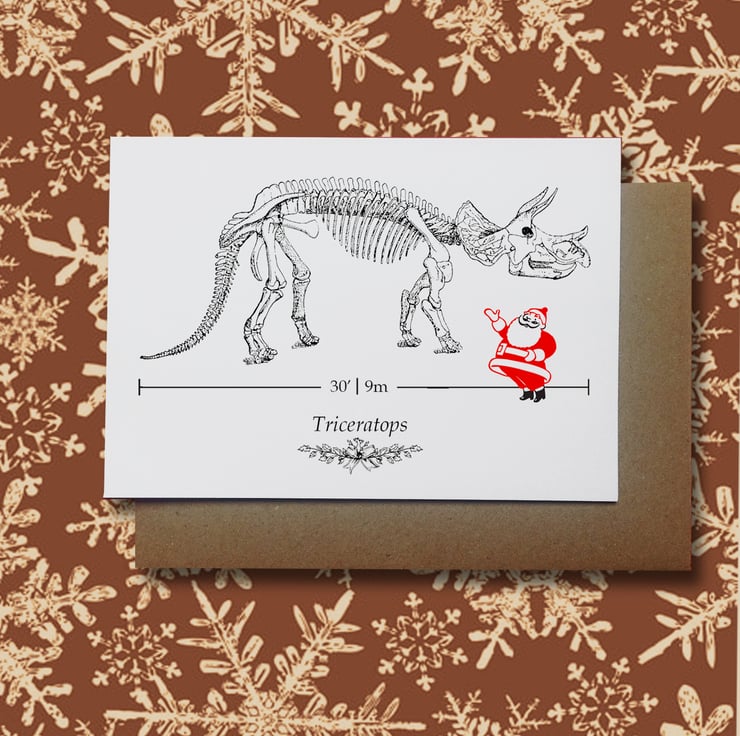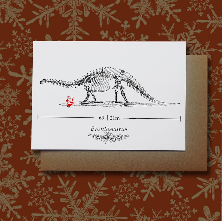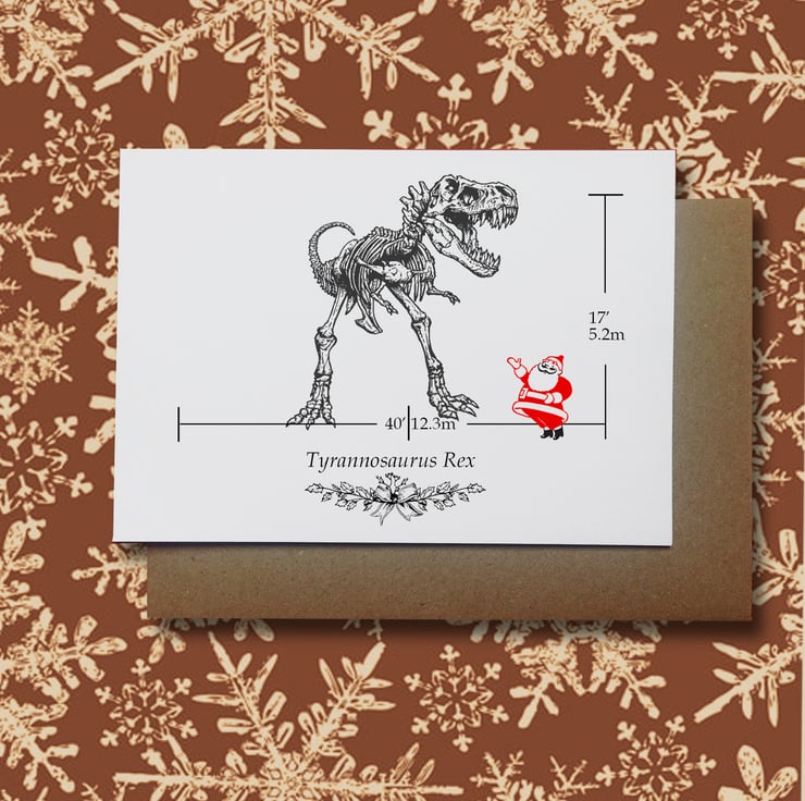 This set of 6 'Santa Scale Dinosaur' cards has been designed to depict how a 6ft Santa would measure up in real life next to each of these 6 dinosaurs, if he was to go to the Natural History Museum for a day out before he gets too busy. Little known fact about Santa is that he is fascinated by dinosaurs and is always giddy as heck to deliver dinosaur games and toys to all the good kids come Christmas time.