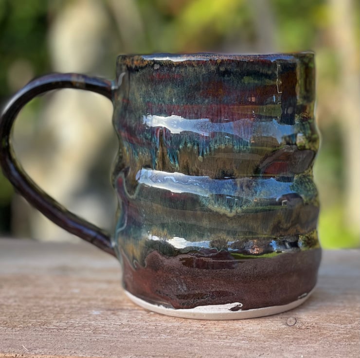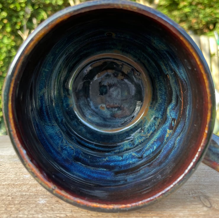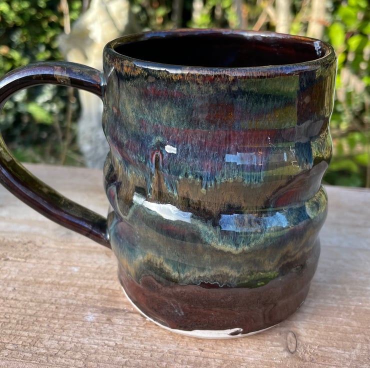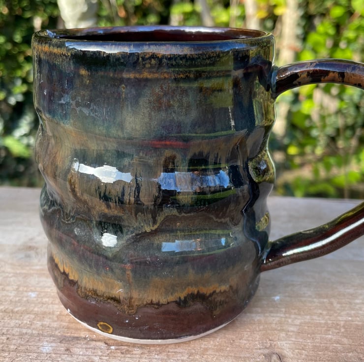 The mug was dried slowly once the handle was added over a few weeks. It was then fired to over 1000c, called a bisque firing. It was then glazed and fired again to over 1200c. This is when the magic happens and the glazes run into each making the individual look of the Made With Mud mug.