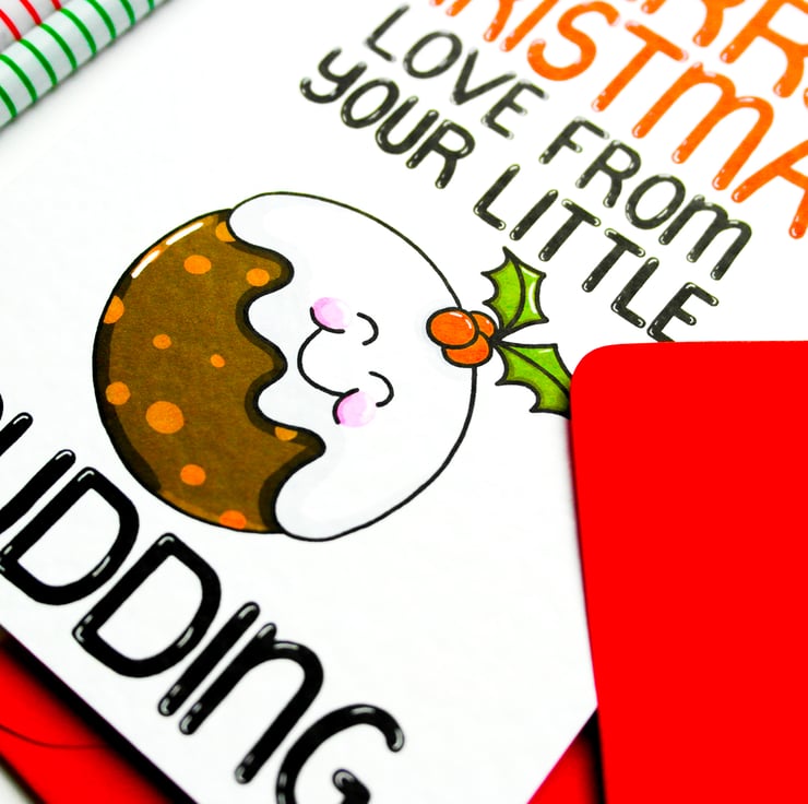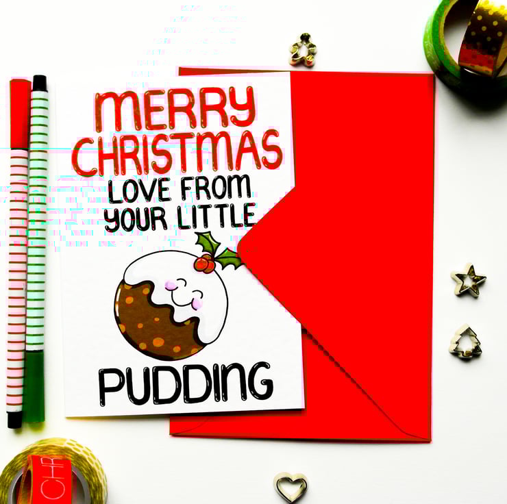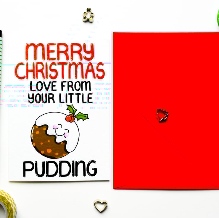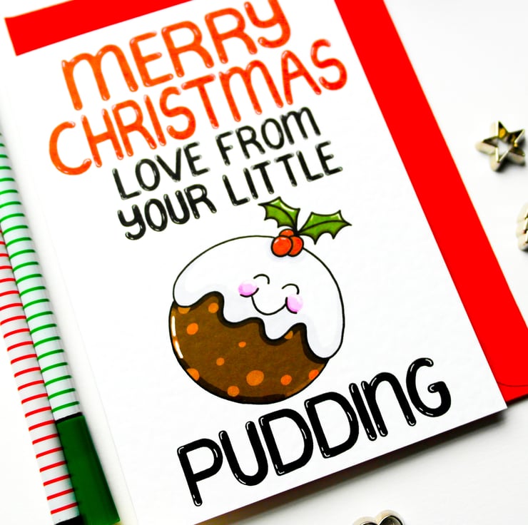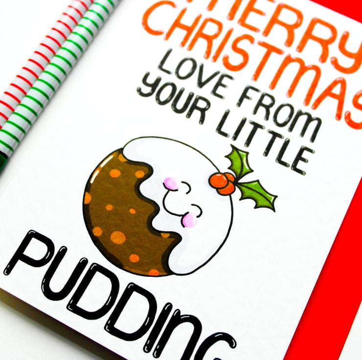 Greeting on front: MERRY CHRISTMAS LOVE FROM YOUR LITTLE PUDDING