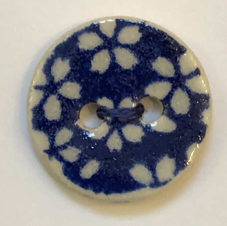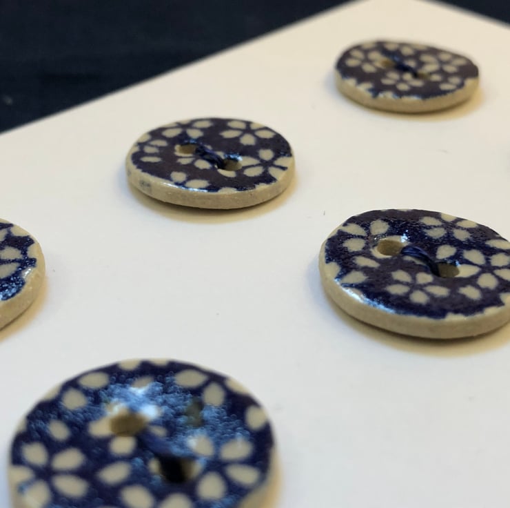 These small round buttons were handcrafted, decorated and fired in my small home studio. The flower pattern was applied to the clay as an underglaze decal (transfer). After bisque firing, the buttons were glazed and fired again to stoneware temperature, which gives them great strength and allows them to be machine washed. The sides and back are not glazed, leaving them with a natural ceramic finish. As each individual button is handcrafted, no two buttons will be exactly the same.