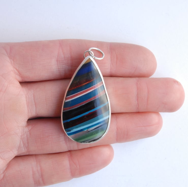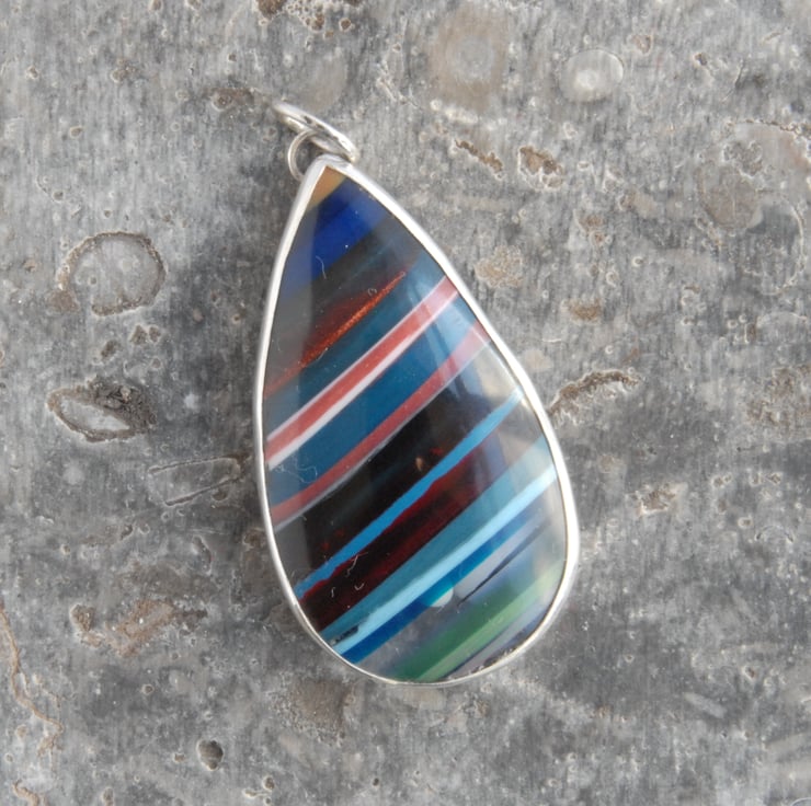 This chunky unisex pendant features stripey Cornish surfite smoothly bezel set in sterling silver, the surfite has horizontal stripes in various shades of blue, teal, cream and red, a couple of the bands are sparkly and some are translucent. This teardrop pendant measures approx 52mm (inc bail) by 24mm, it comes with a sterling silver snake chain but the bail is large enough to fit a cord or thong if you wanted to swap it over. The surface of the surfite has little dimples from air bubbles being trapped as the material was formed, the back of the pendant show a white layer that had trickled down the block of rough.