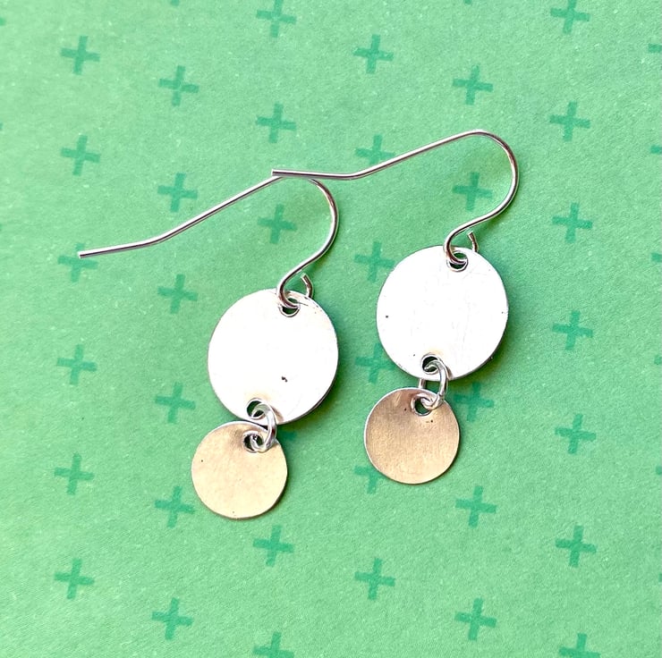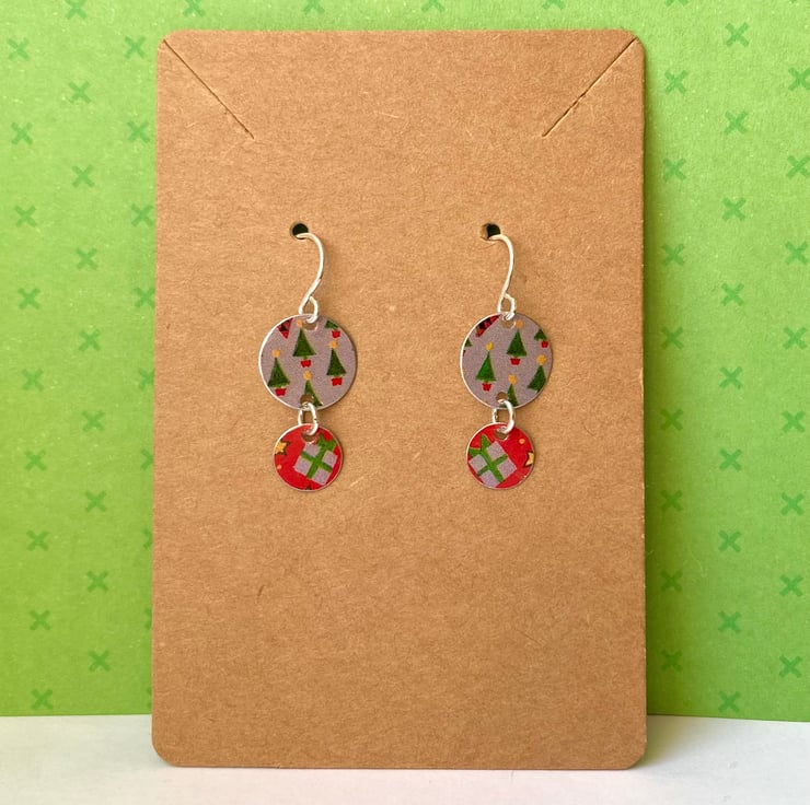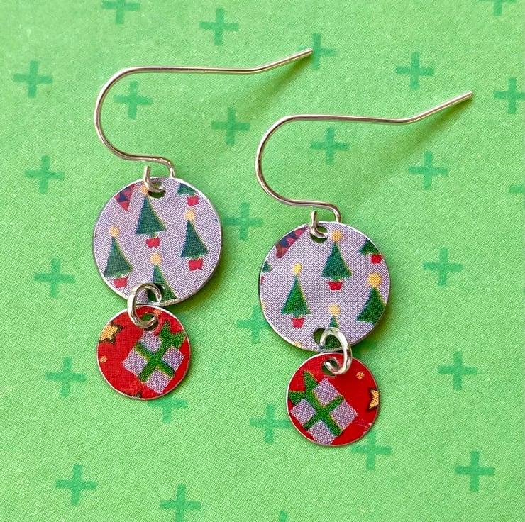 12mm and 8mm circles have been hand cut from a small vintage Christmas tin and joined with silver plated rings to create these circle drop earrings. They feature cute little green Christmas trees and presents on a red background. Bring a bit of festive cheer to your ears!