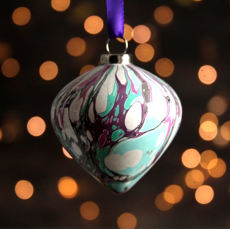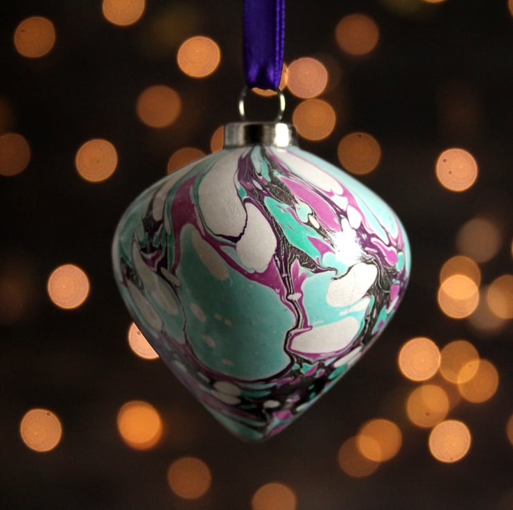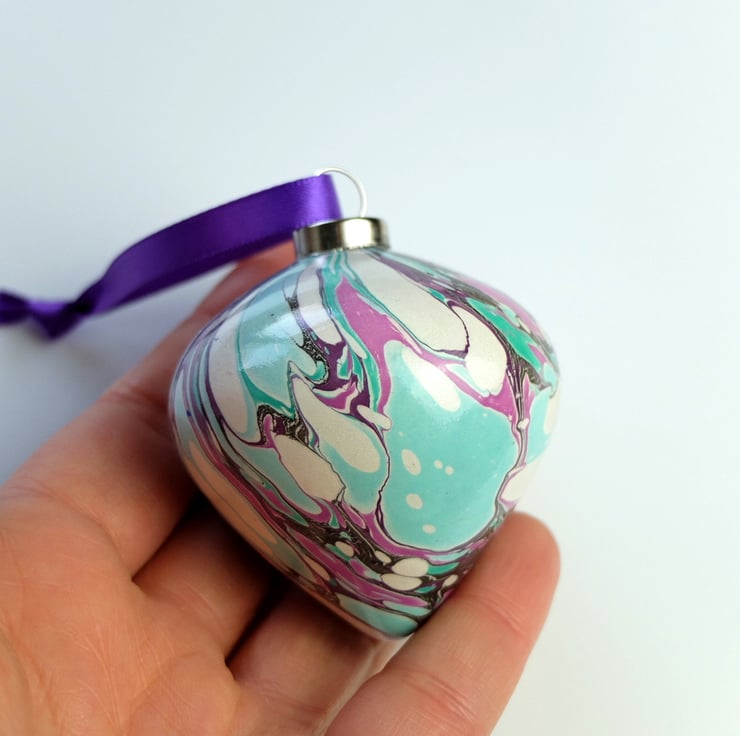 The baubles in this range are marbled directly onto the ceramic surface - a technique which is much more difficult than it sounds! Each bauble is marbled from a different bath, so they are all different and totally unique. They are lots of fun to make and totally addictive!