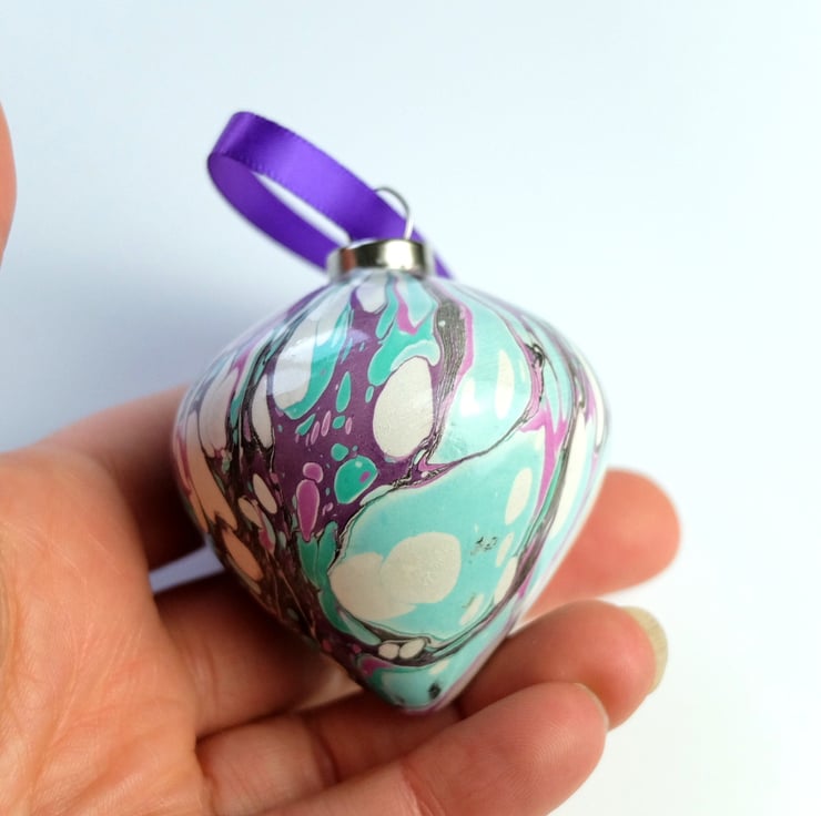 Pointed drop in shape and 5cm in diameter, length is about 6cm including the metal cap and loop. Hung from an approximately 5cm length of 7mm purple satin ribbon and varnished to give a glossy shine and some protection.