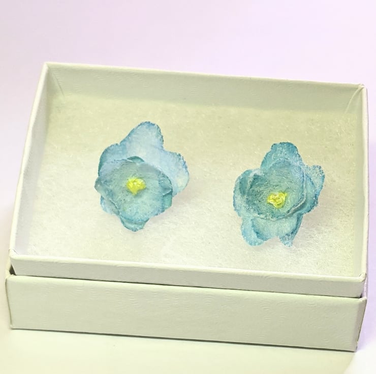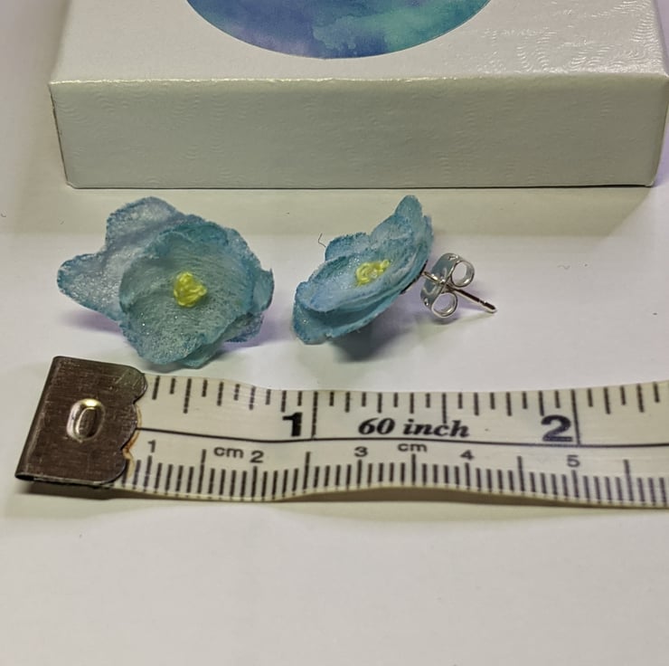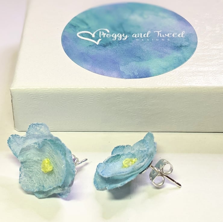 This pair of blue stud earrings is made from a versatile textile which I paint, heat treat and stitch to create these pretty flowers.