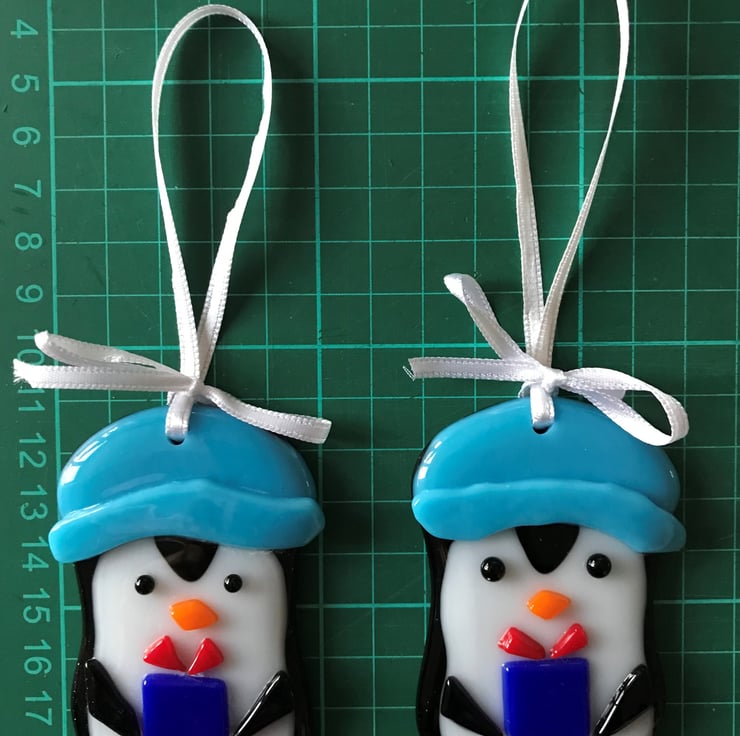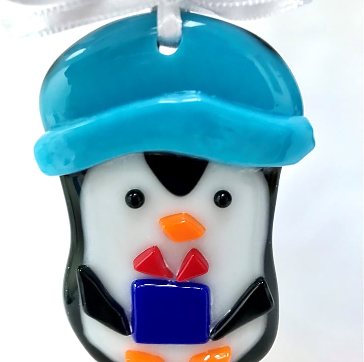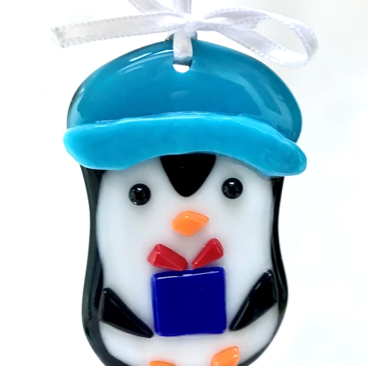 This cute penguin decoration has had two firings in the kiln. The first went to 800 degrees Celsius to create the base body and hat. A second firing at 735 degrees Celsius tac fused his beak, feet, flippers, gift and hat rim. A hole has been drilled so it can hang from white satin ribbon.