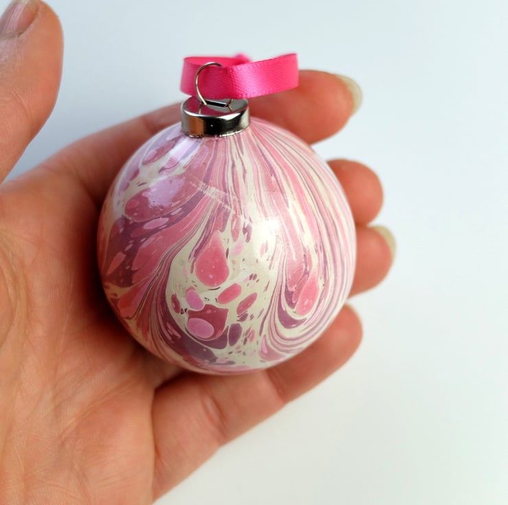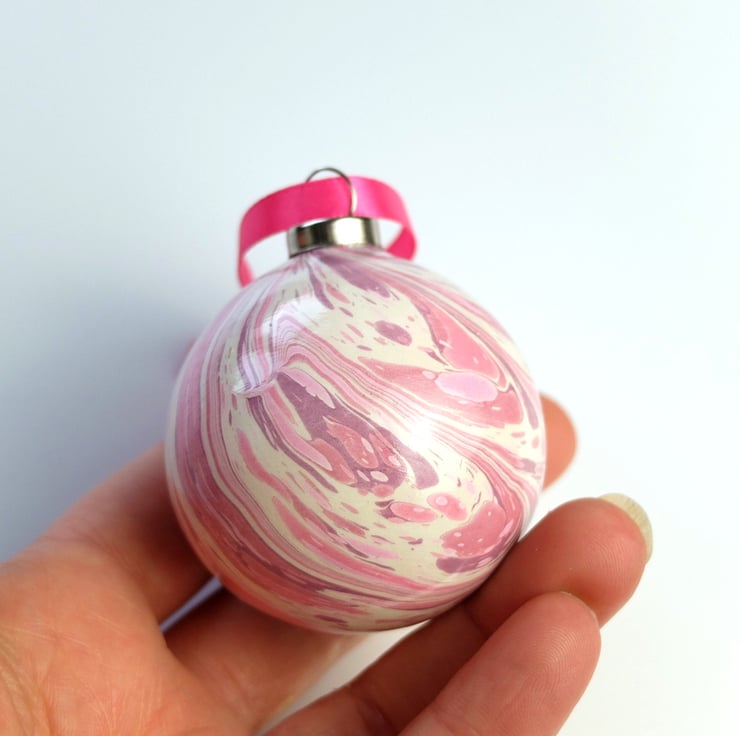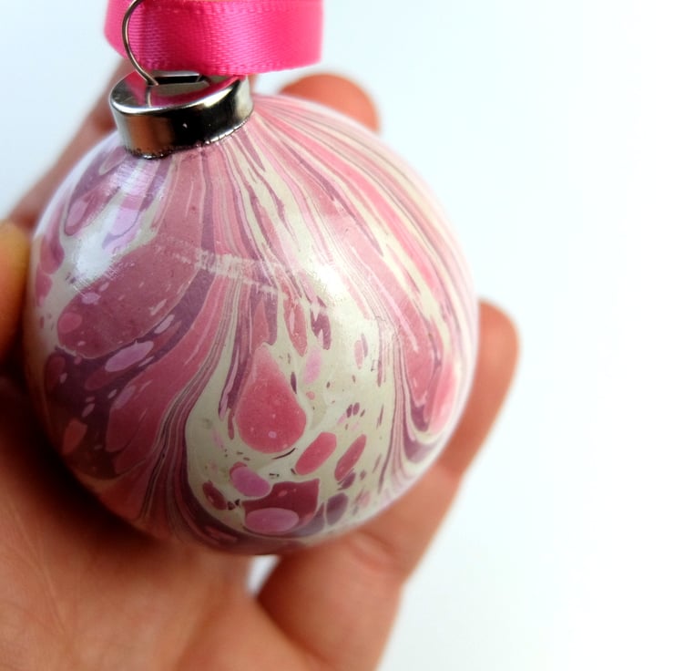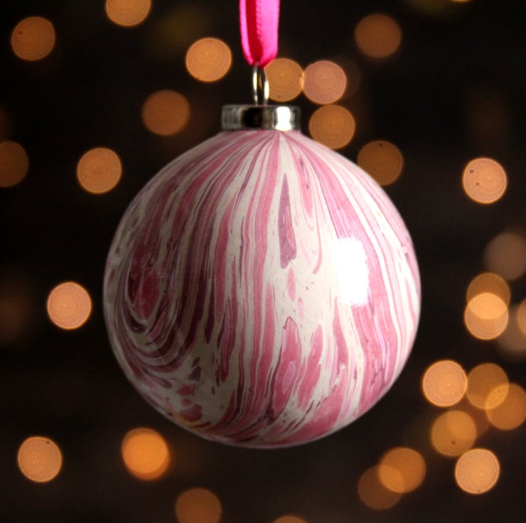 The baubles in this range are marbled directly onto the ceramic surface - a technique which is much more difficult than it sounds! Each bauble is marbled from a different bath, so they are all different and totally unique. They are lots of fun to make and totally addictive!