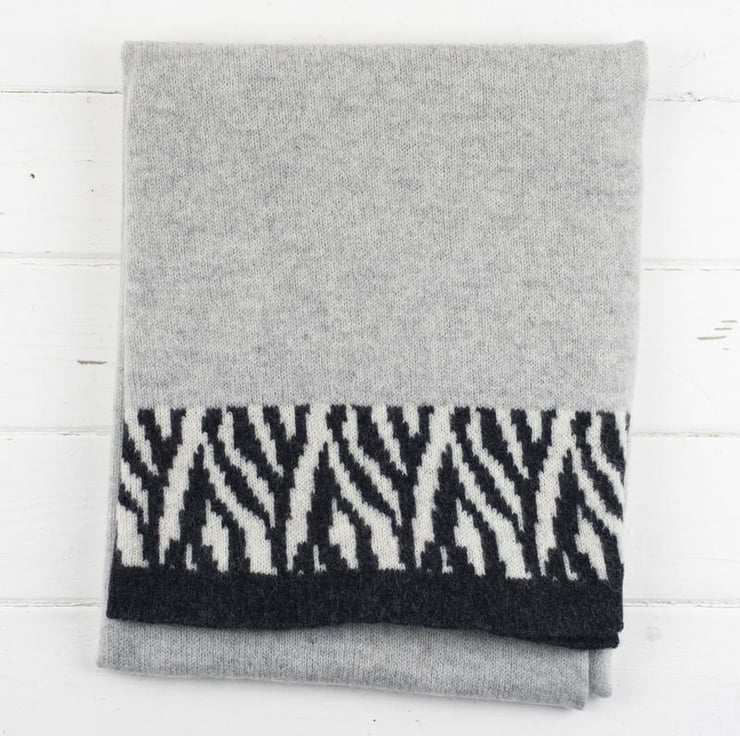 This wrap is knitted using charcoal, ecru and pale grey British spun lambswool, with the zebra pattern at each end of the scarf.