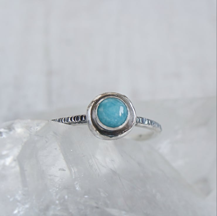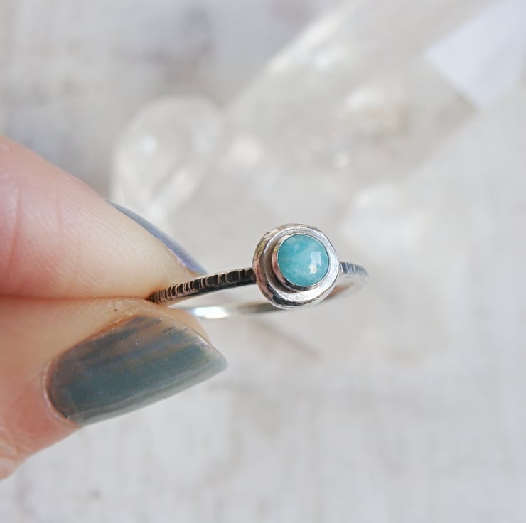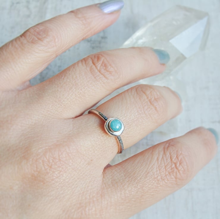 Organic pebble shapes made from recycling my scrap silver with amazonite gems stacked on top of my signature woodland hammered skinny ring bands.