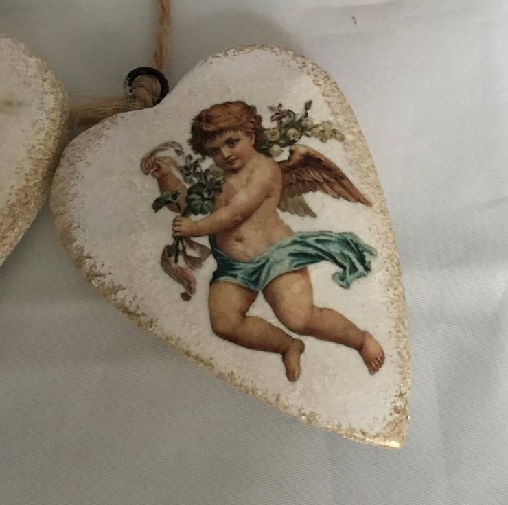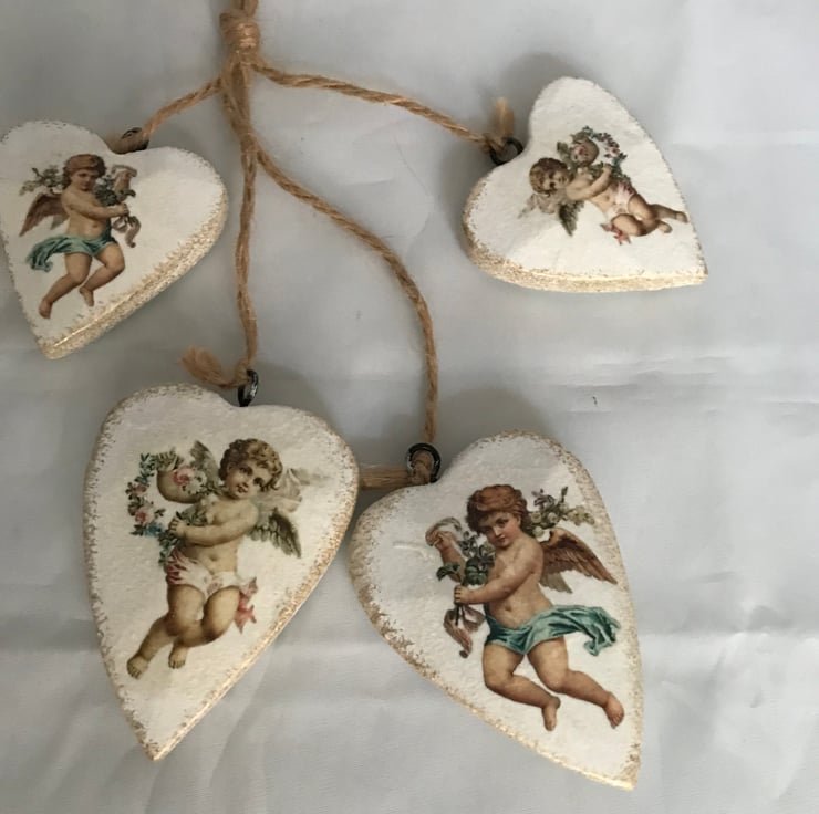 The hearts have been painted, and then sponge painted to give an older, more rustic look, and decorated with rice paper images of cherubs on the front and a small, simple star design (from a paper napkin) on the reverse.